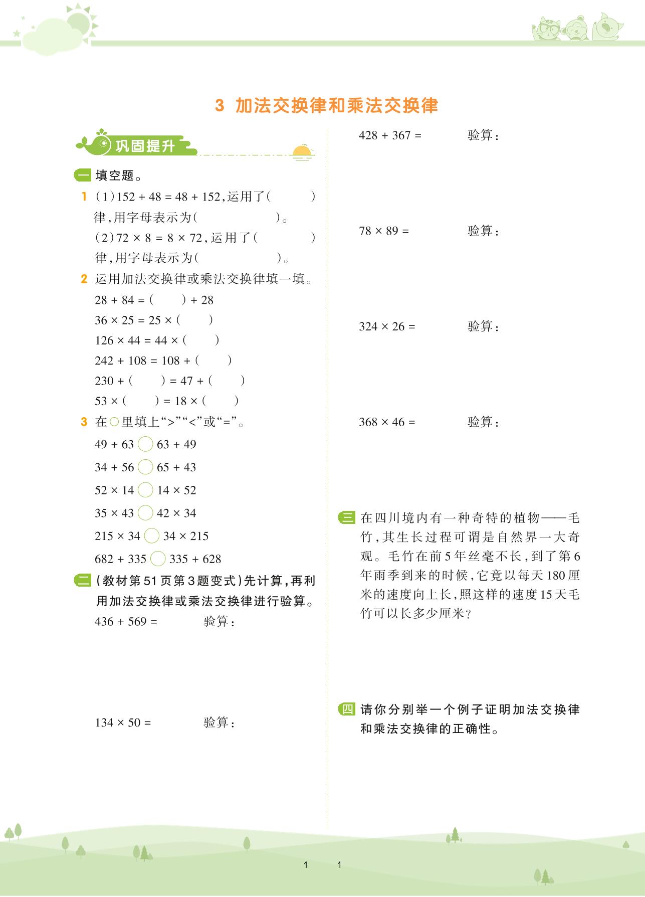 2020上册四年级数学北师版 第四单元 运算律——3 加法交换律和乘法交换律