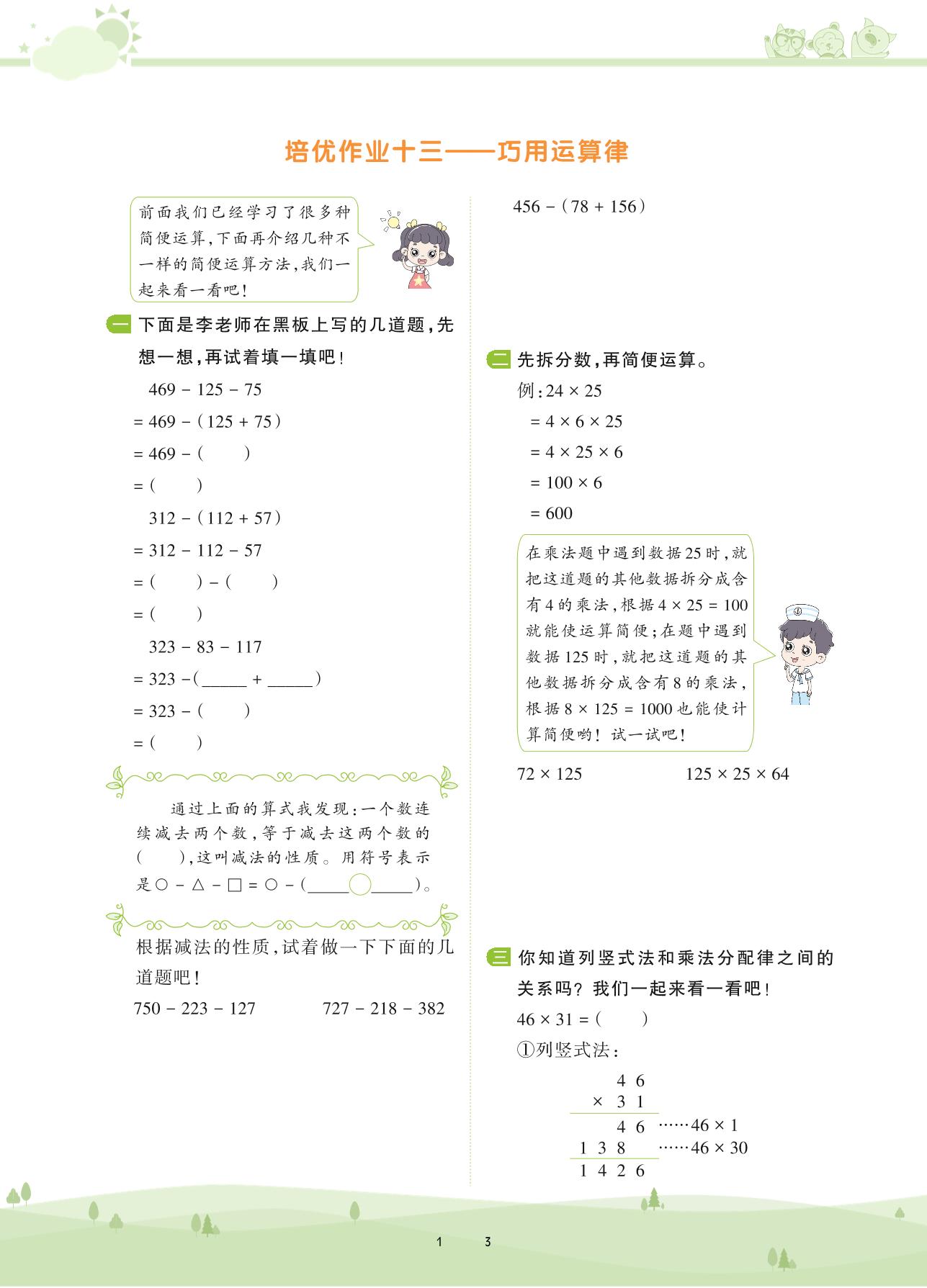 2020上册四年级数学北师版 第四单元 运算律——培优作业十三——巧用运算律