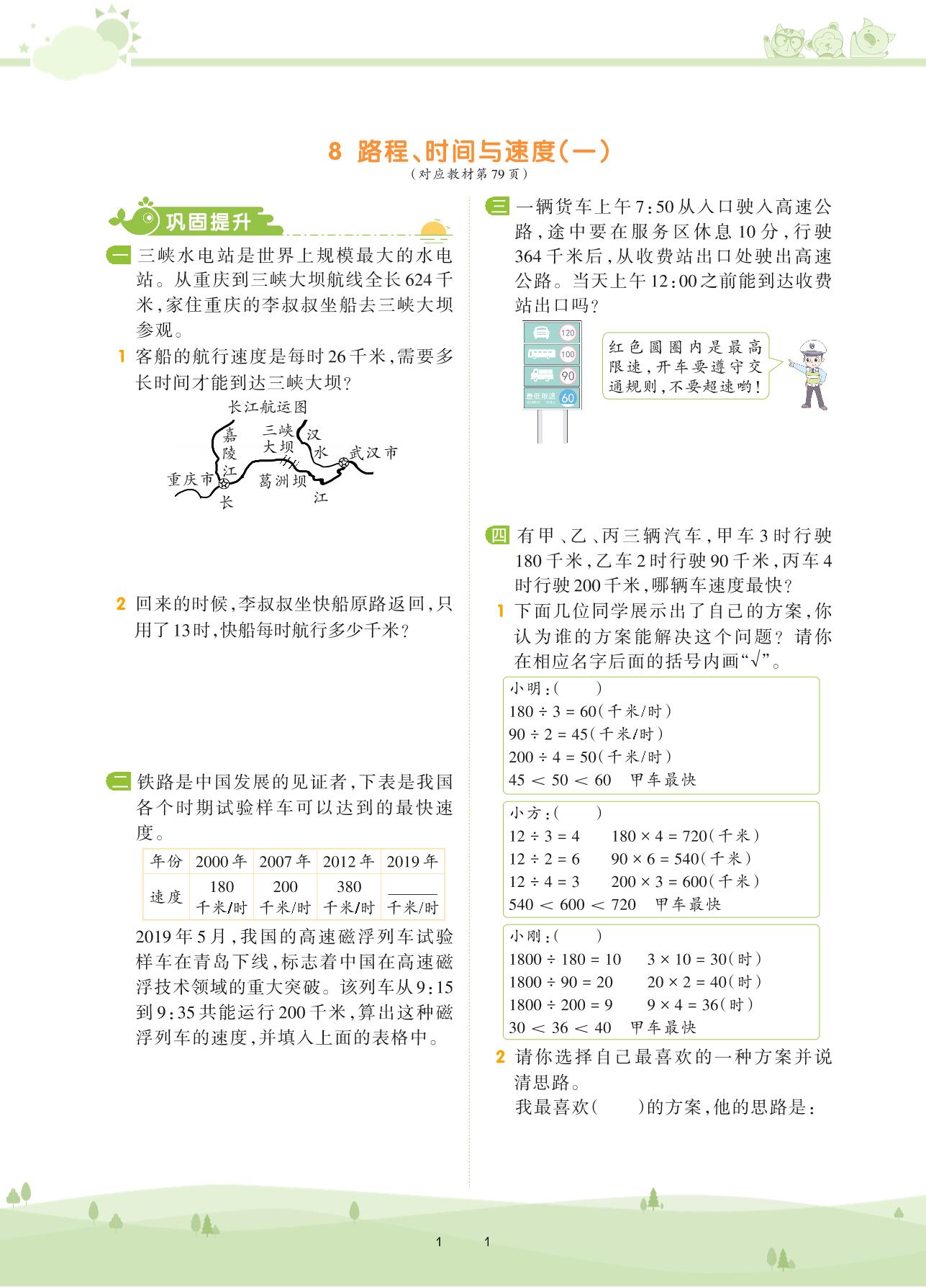 2020上册四年级数学北师版 第六单元 除法——8 路程、时间与速度(一)