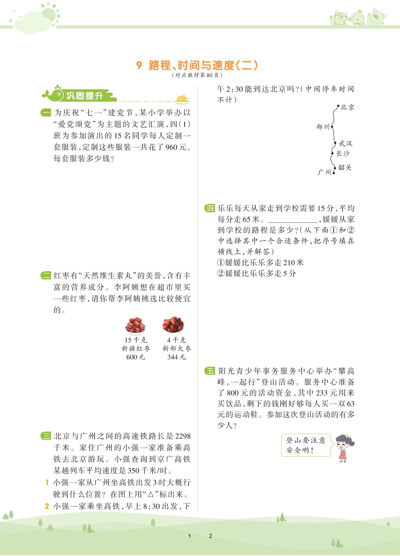 2020上册四年级数学北师版 第六单元 除法——9 路程、时间与速度(二)