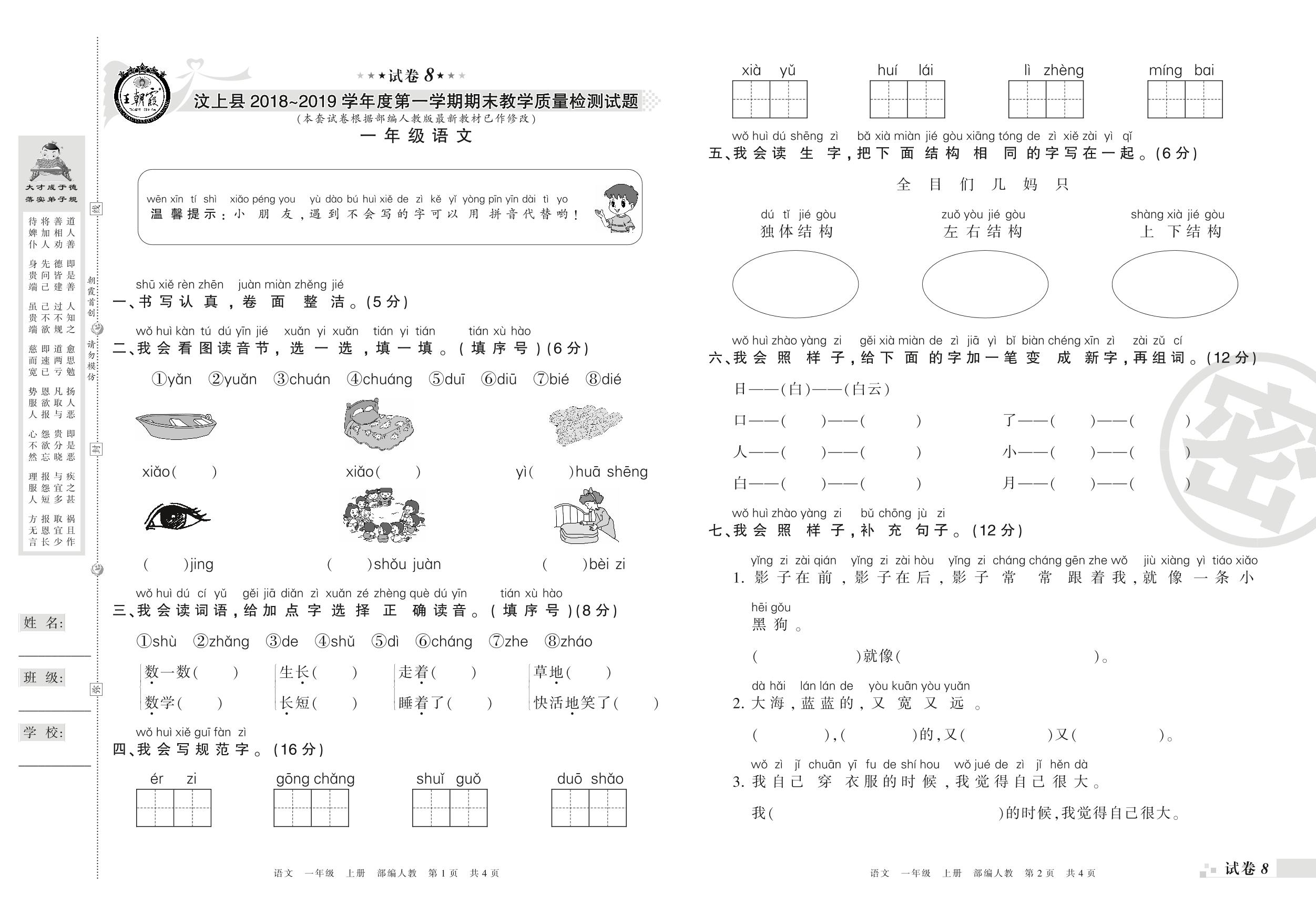 2018-2019学年第一学期济宁市汶上县一年级语文试卷(人教版)【8】