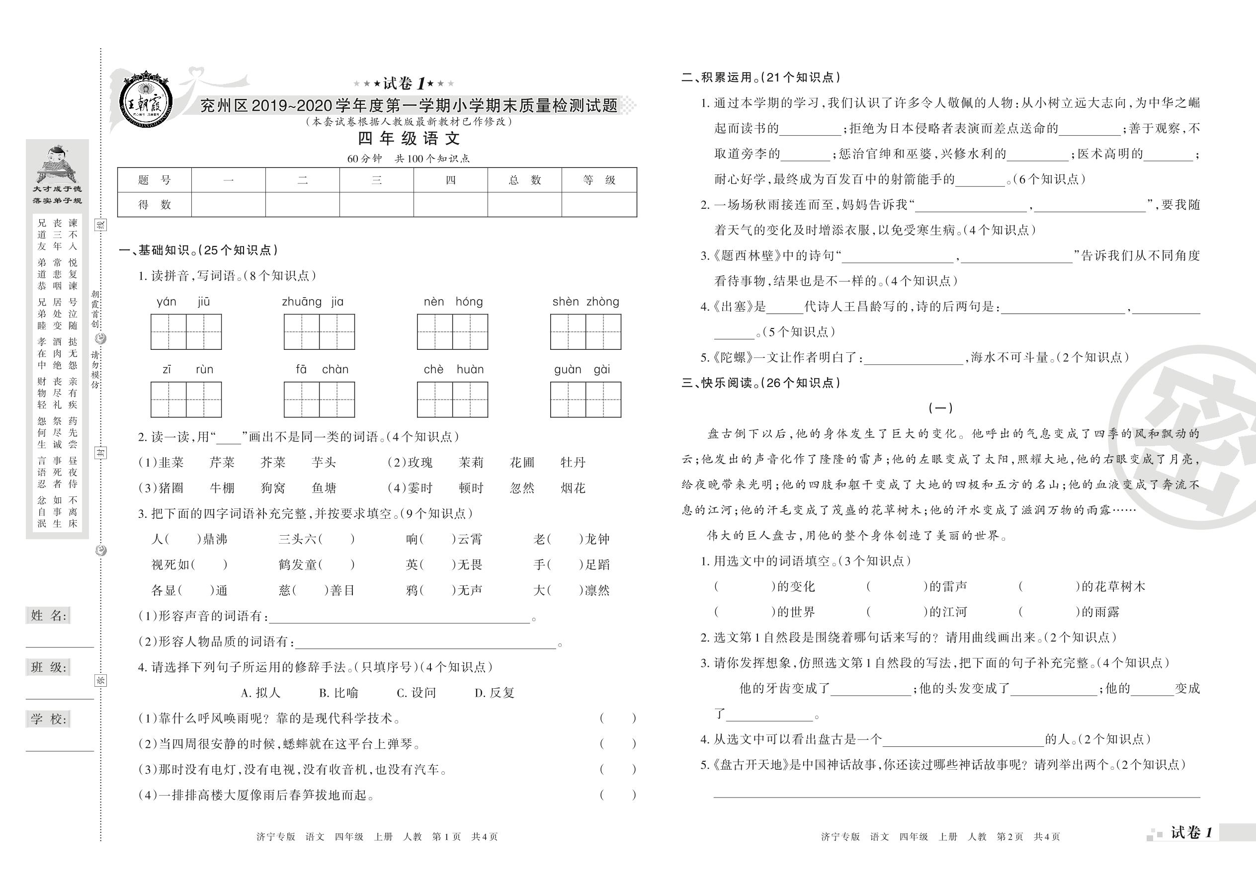 2019-2020学年第一学期济宁市兖州区四年级语文试卷(人教版)【1】