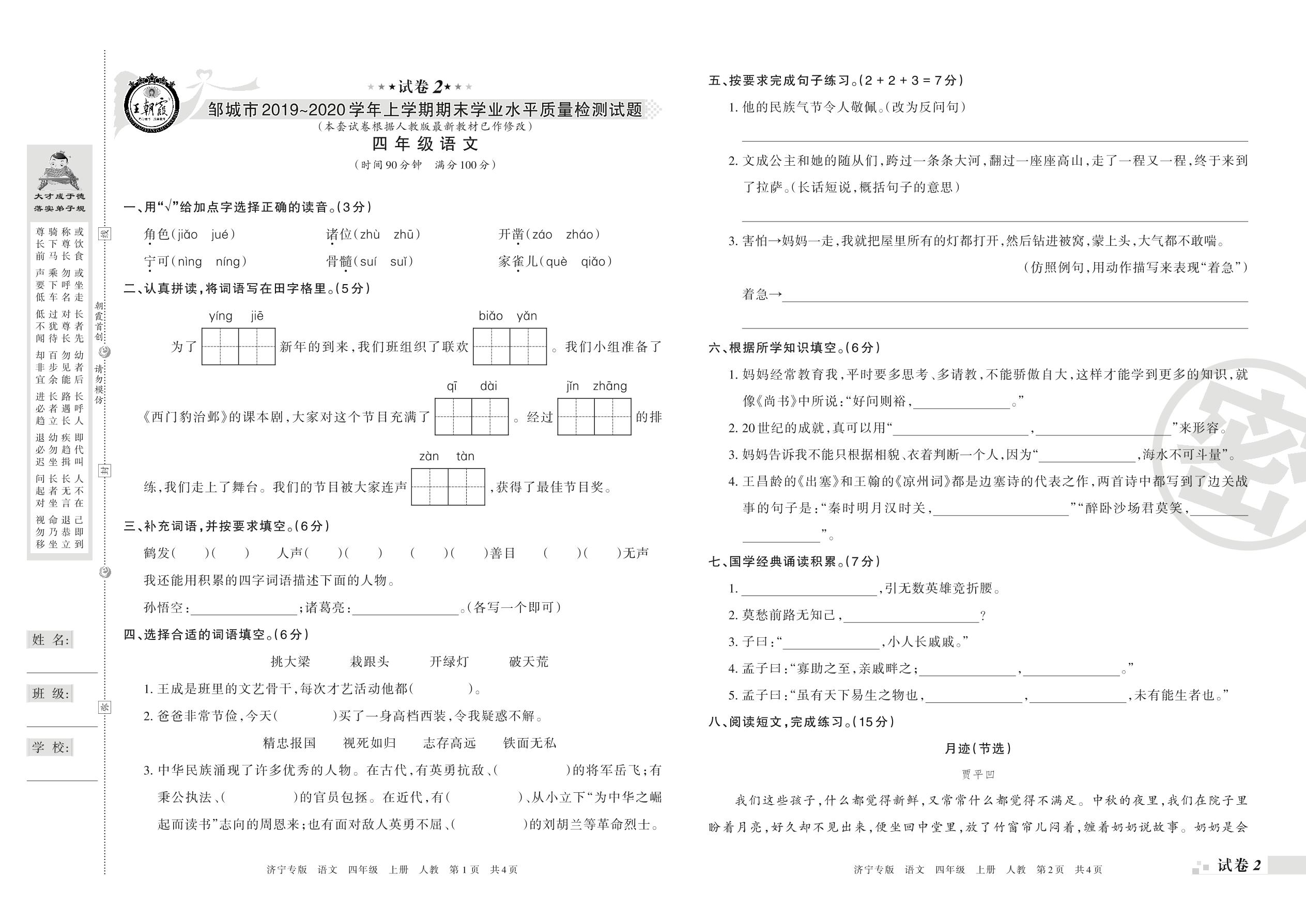 2019-2020学年第一学期邹城市四年级语文试卷(人教版)【2】