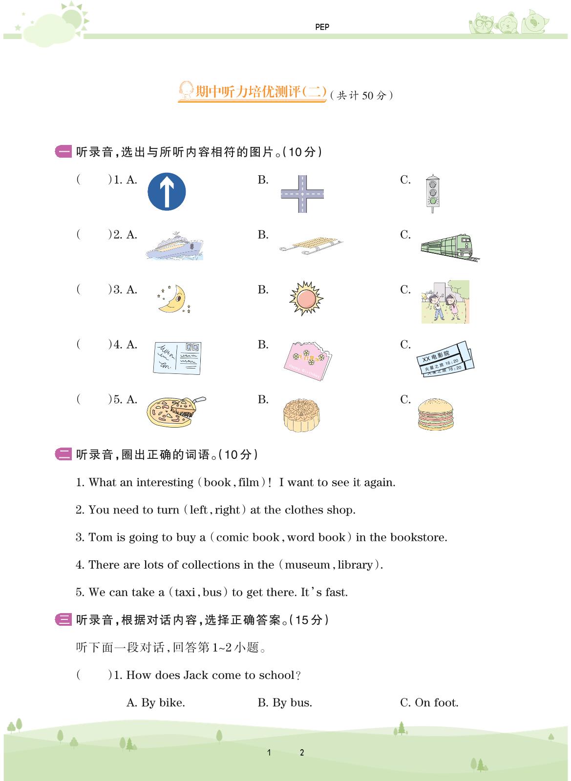 2020上册六年级英语PEP版 期中听力培优测评(二)