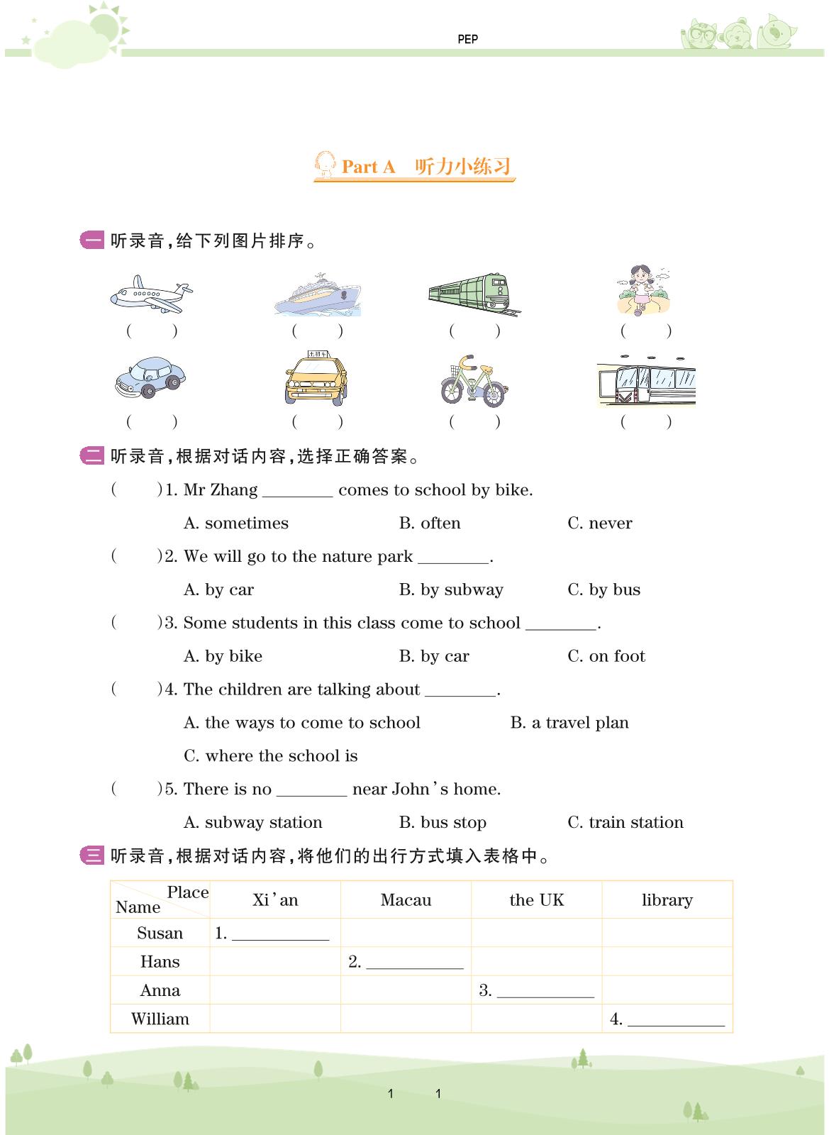 2020上册六年级英语PEP版 Unit 2——Part A 听力小练习