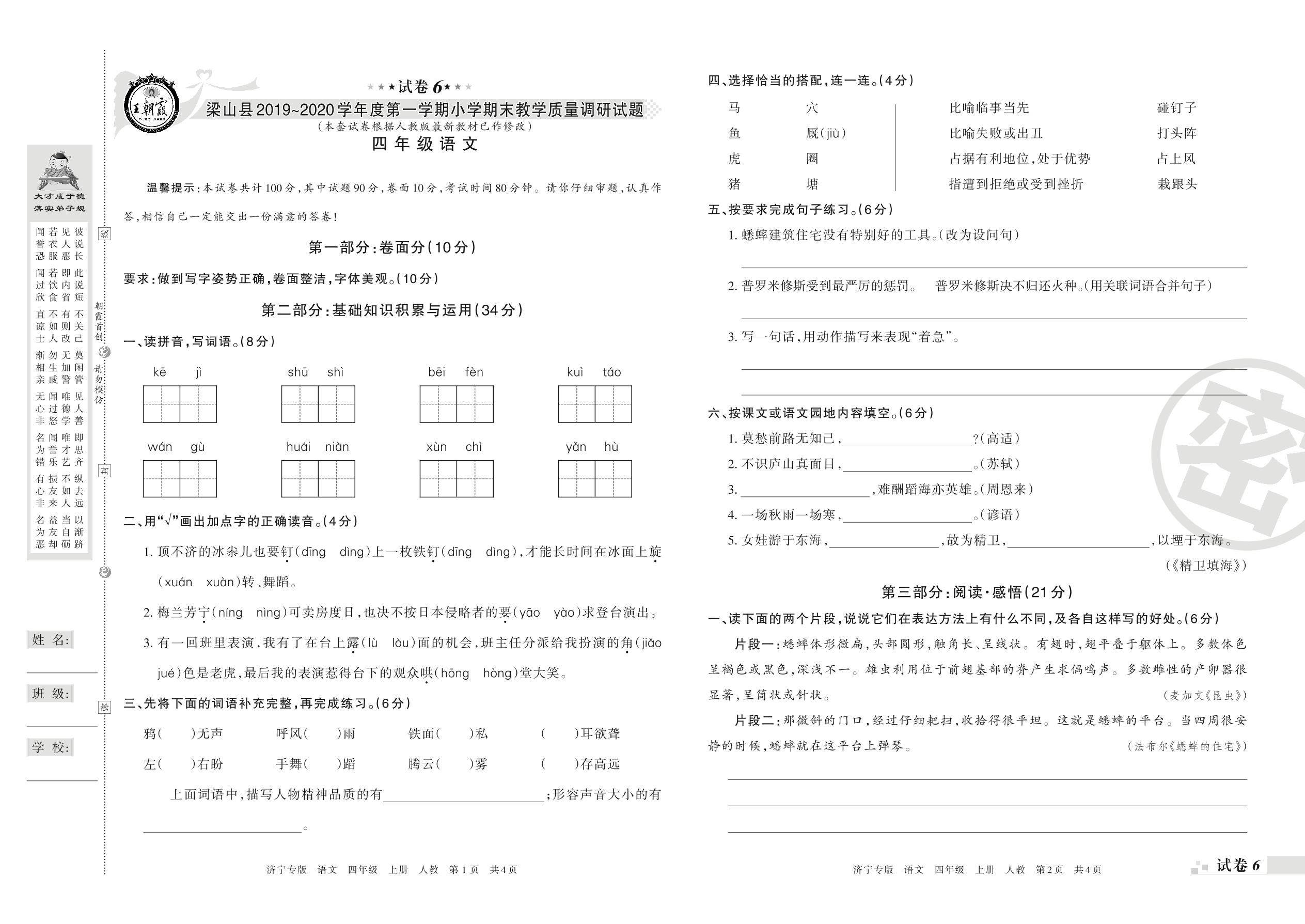 2019-2020学年第一学期济宁市梁山县四年级语文试卷(人教版)【6】