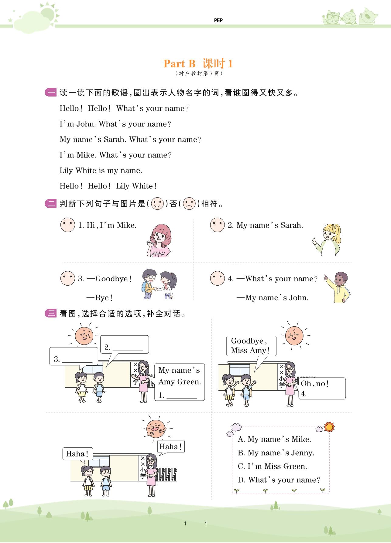 2020上册三年级英语PEP版 Unit 1—Part B 课时1