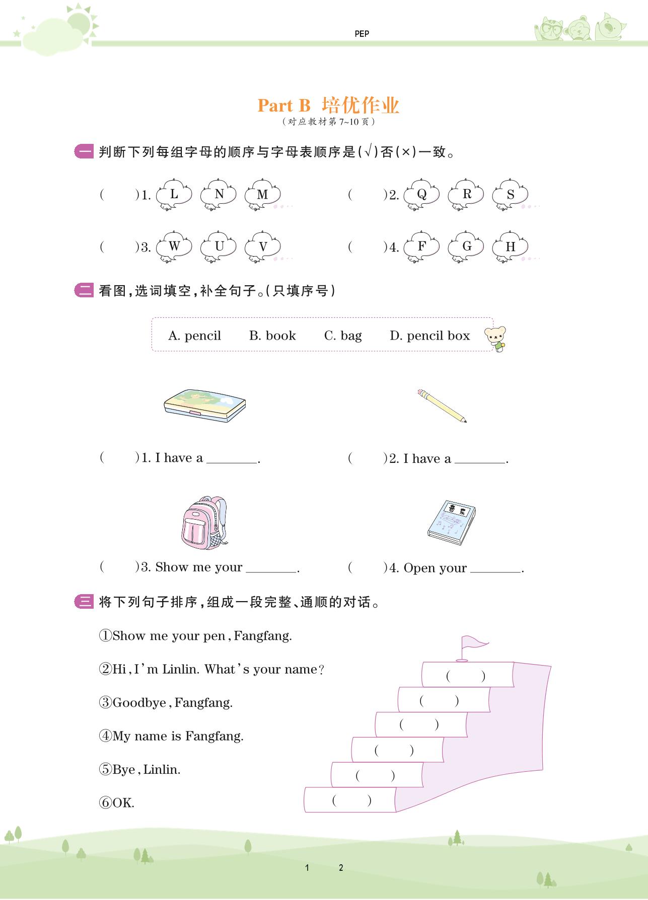 2020上册三年级英语PEP版 Unit 1—Part B 培优作业