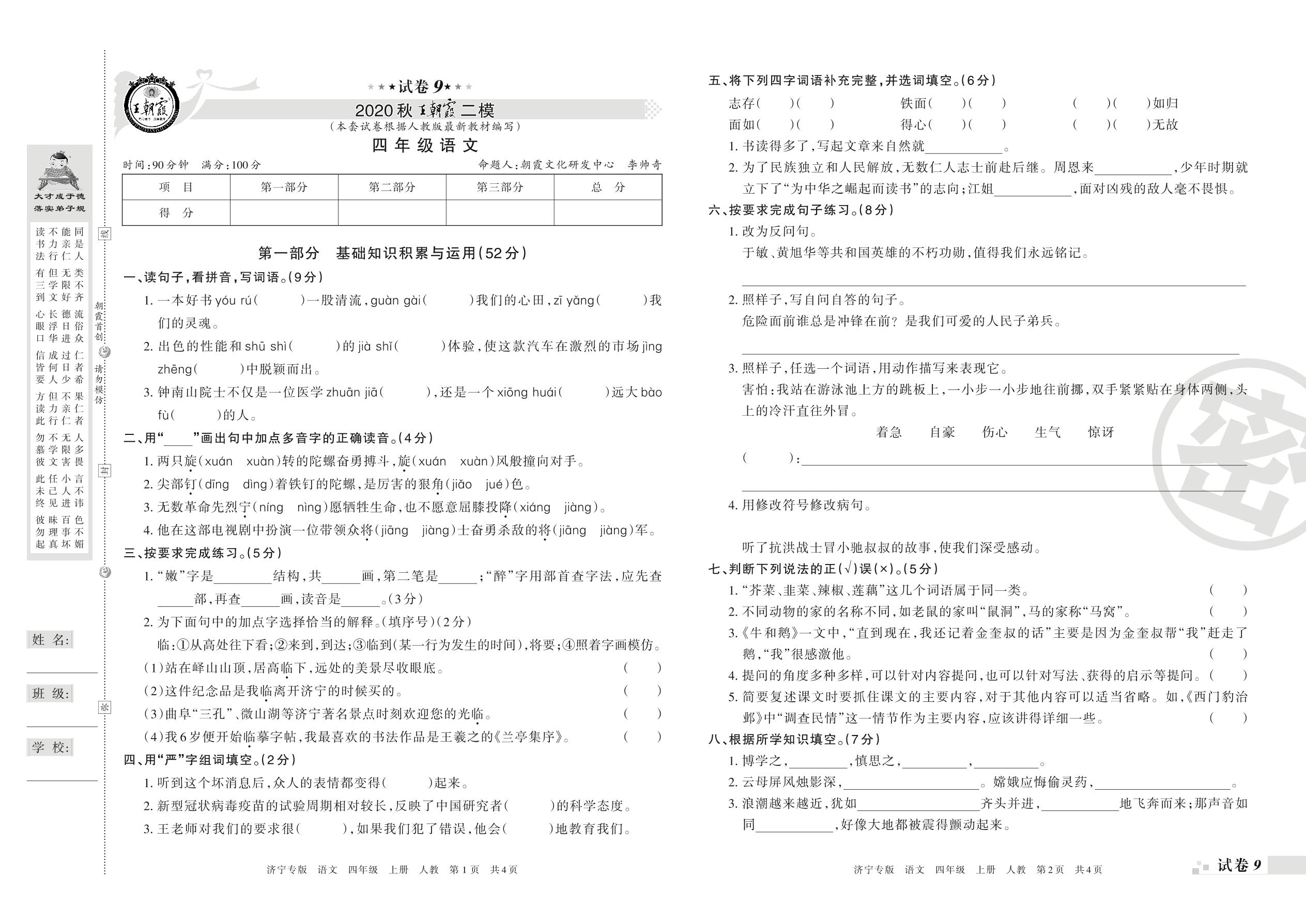 王朝霞期末模拟卷四年级上册语文(人教版)_R210801185643【9】