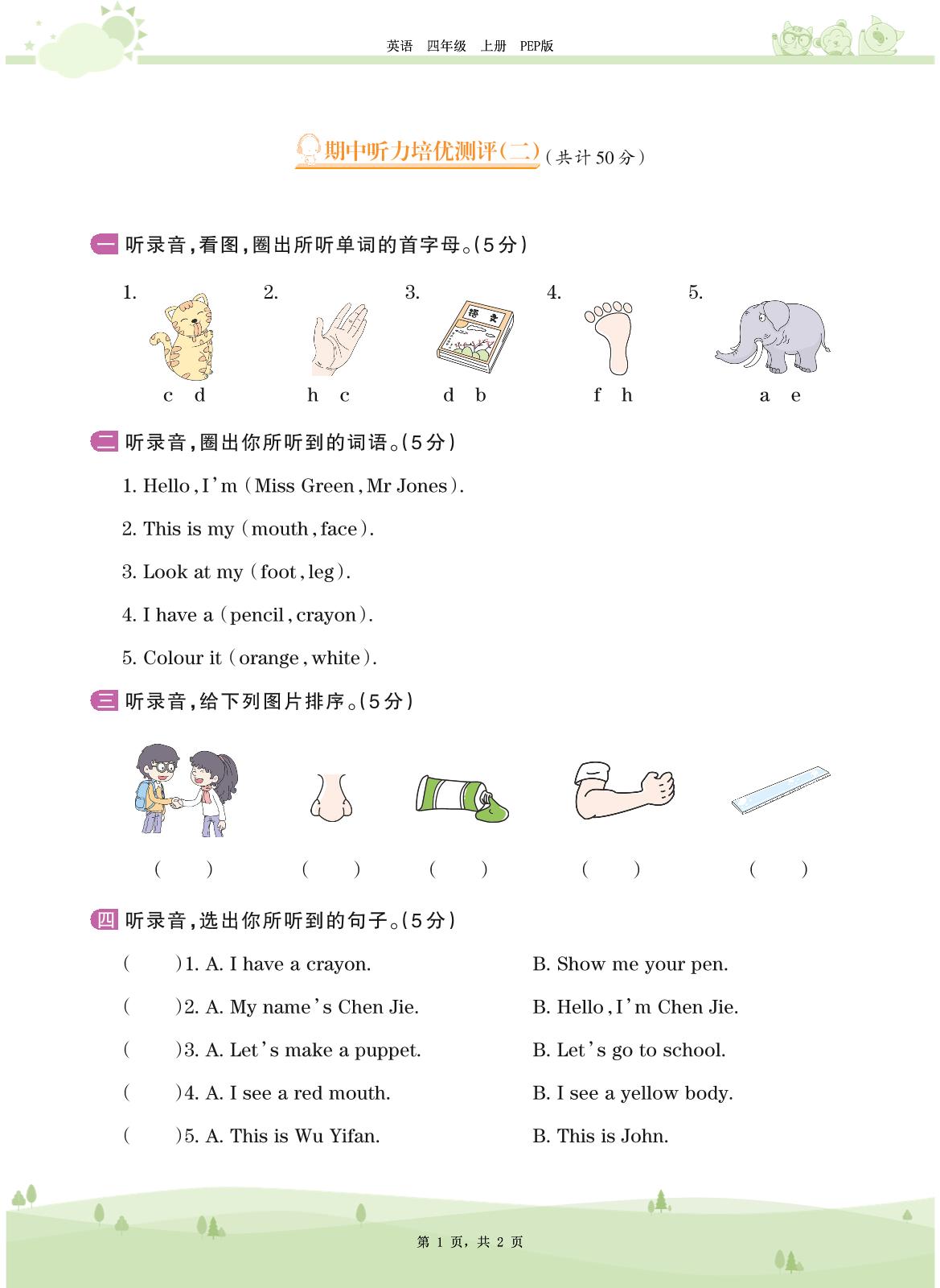 2020上册三年级英语PEP版 期中听力培优测评(二)
