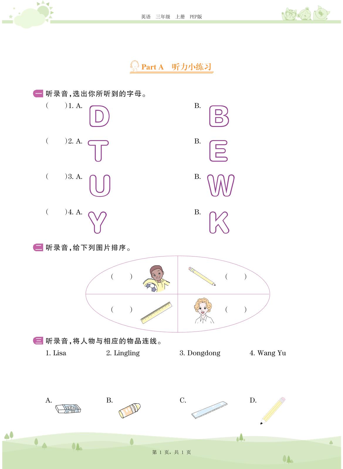 2020上册三年级英语PEP版 Unit 1——Part A 听力小练习