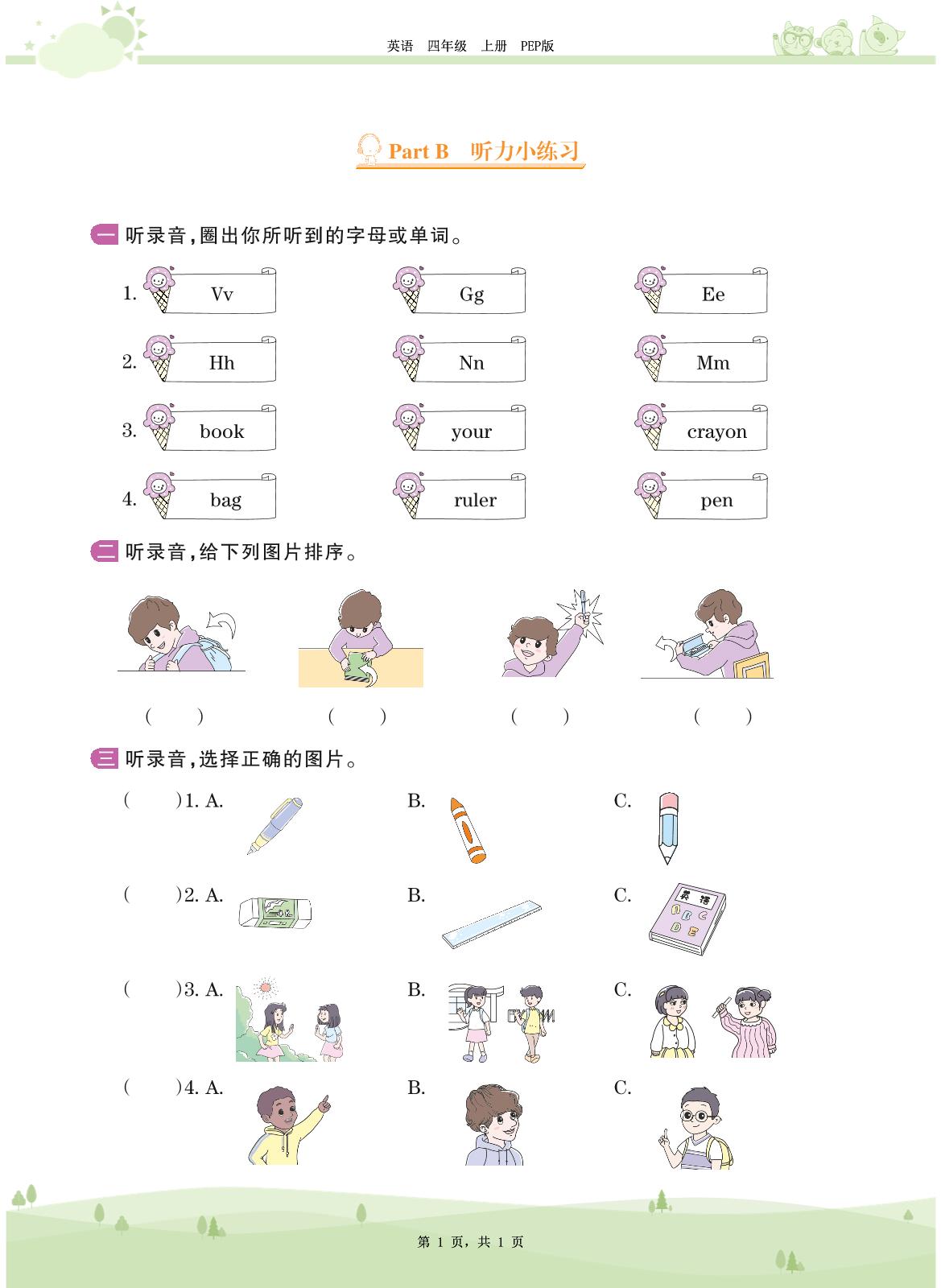 2020上册三年级英语PEP版 Unit 1——Part B 听力小练习