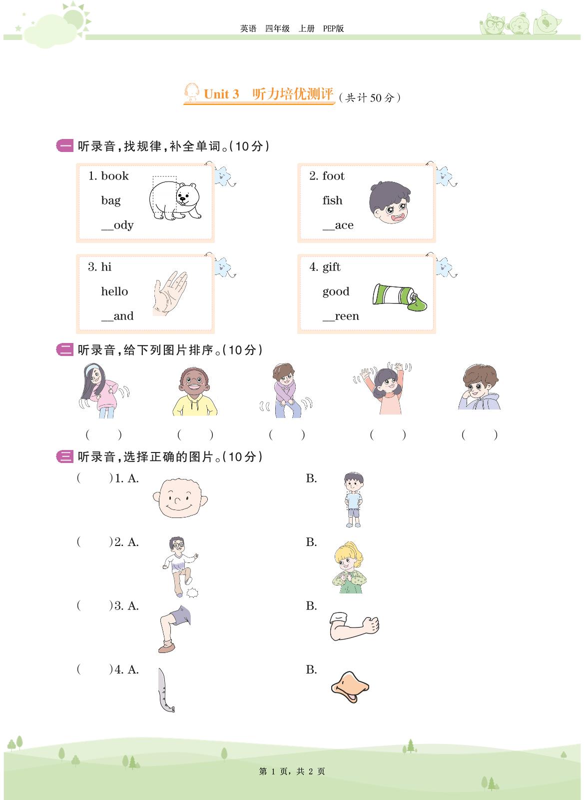 2020上册三年级英语PEP版 Unit 3 听力培优测评