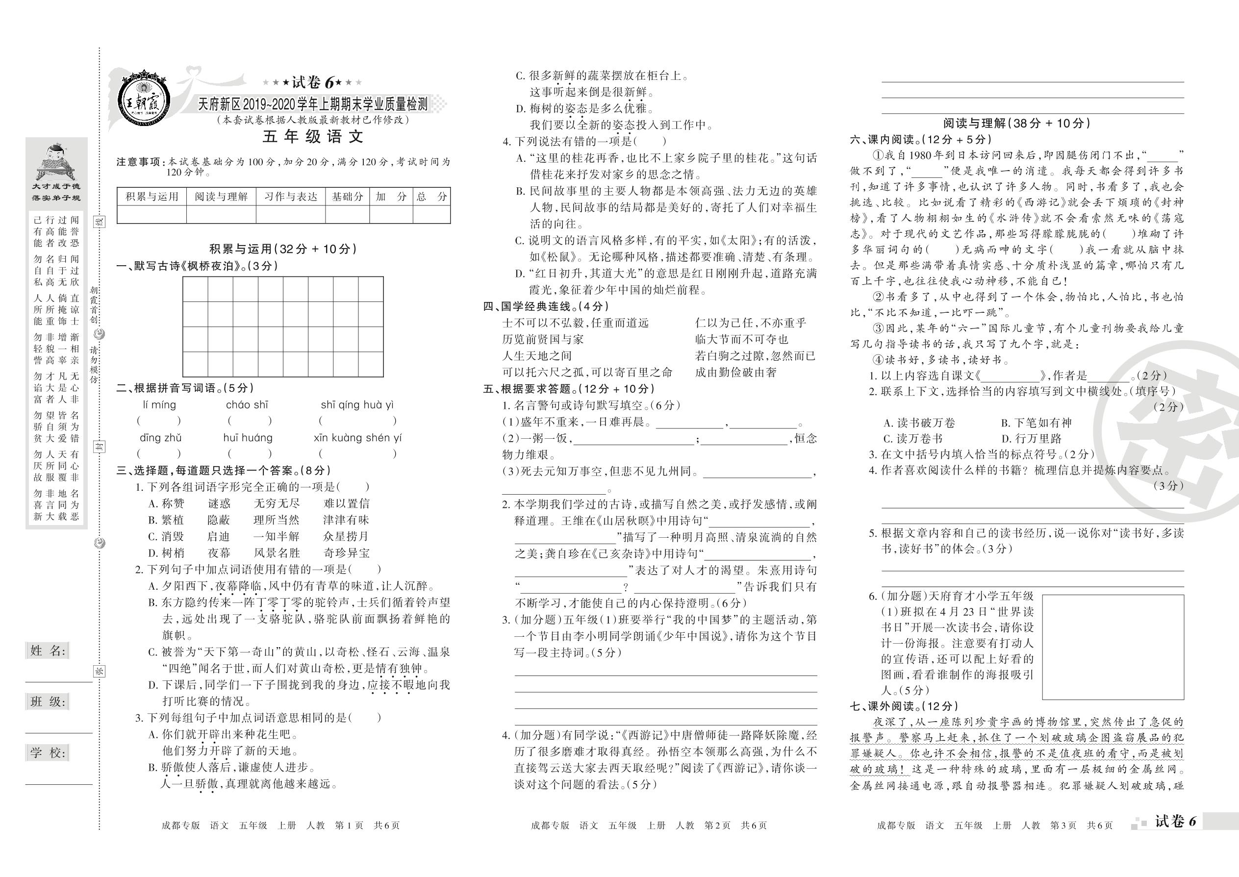 2019-2020学年第一学期成都市天府新区五年级语文试卷(人教版)【6】