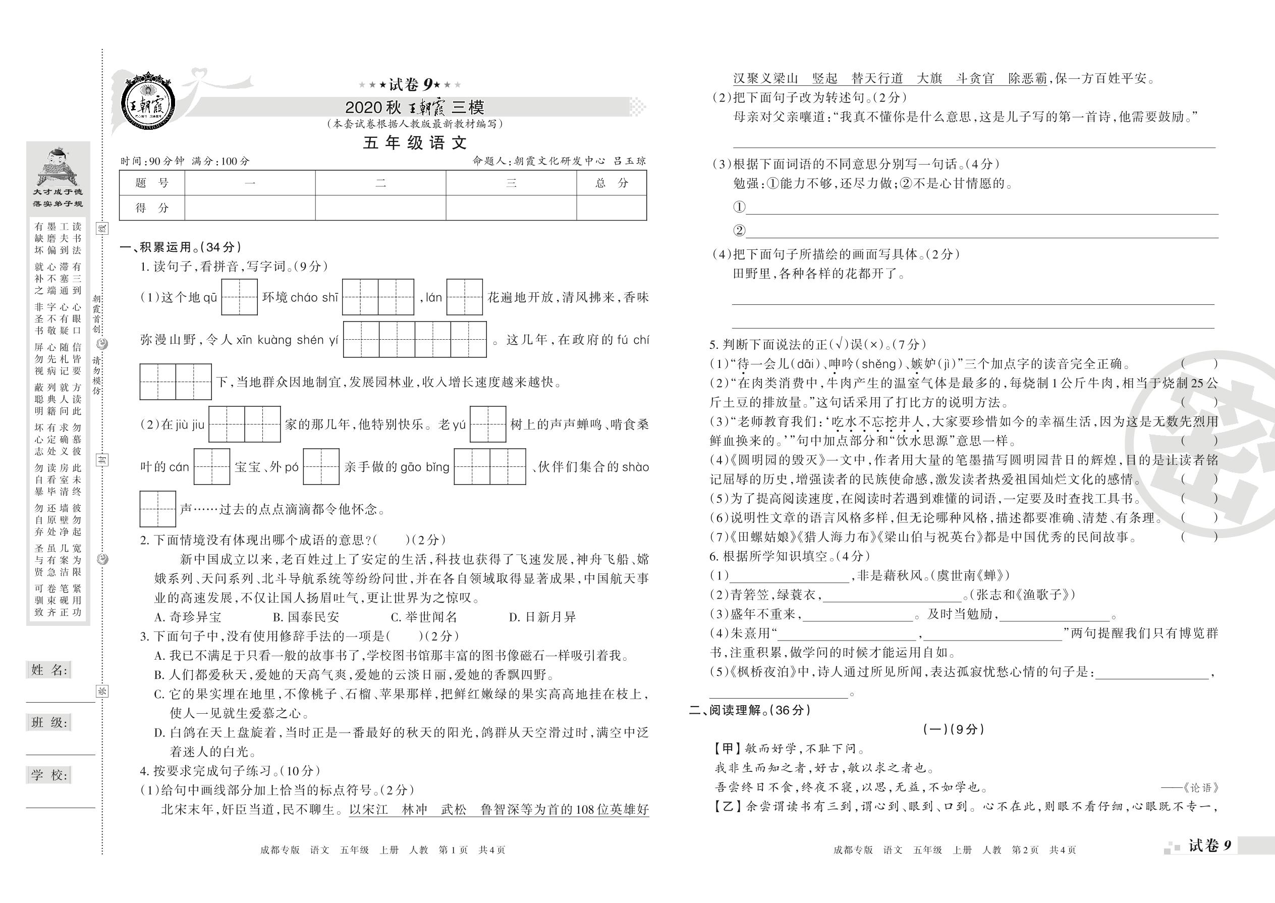 王朝霞期末模拟卷五年级上册语文(人教版)_R210801185752【9】