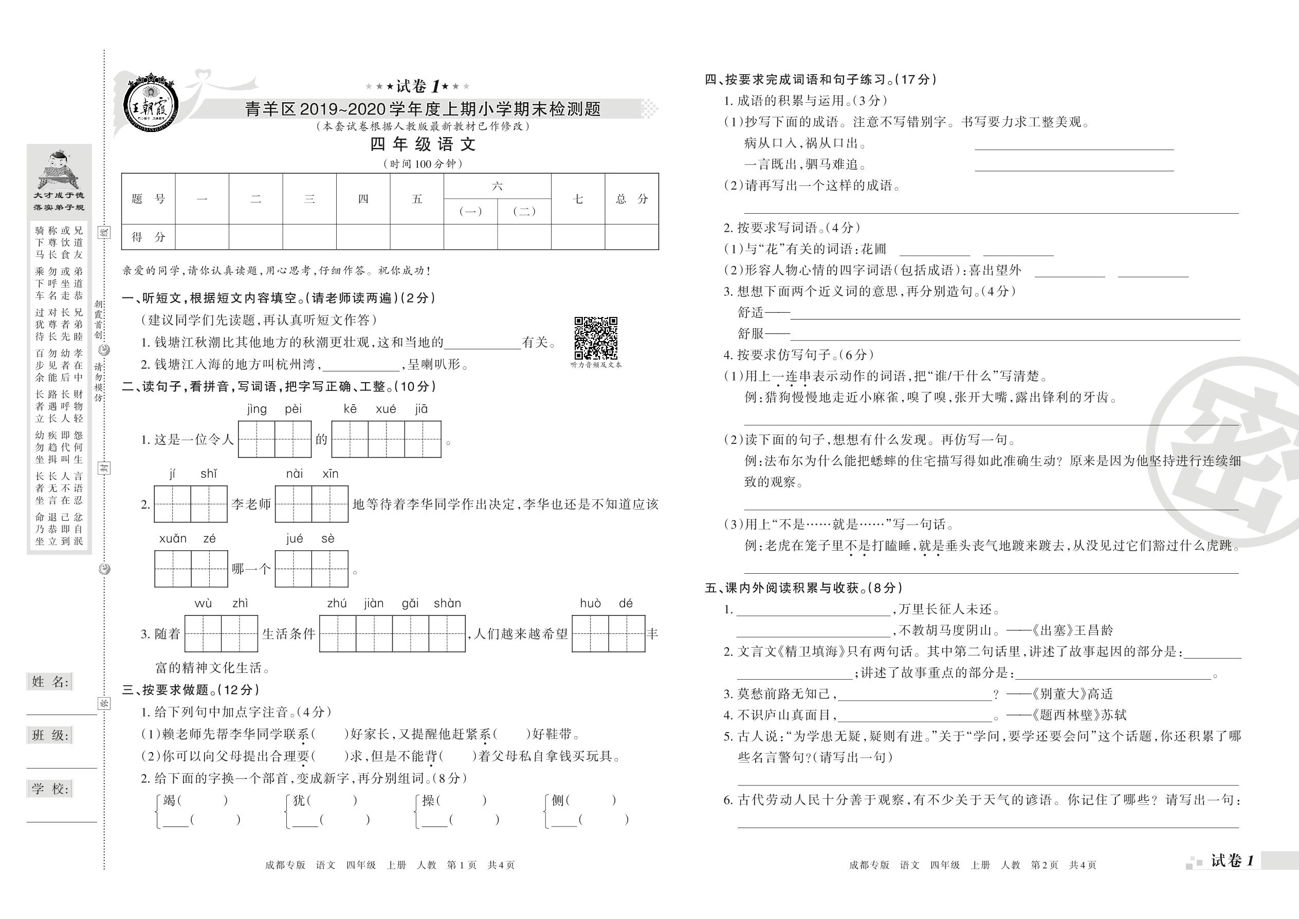 2019-2020学年第一学期成都市青羊区四年级语文试卷(人教版)【1】