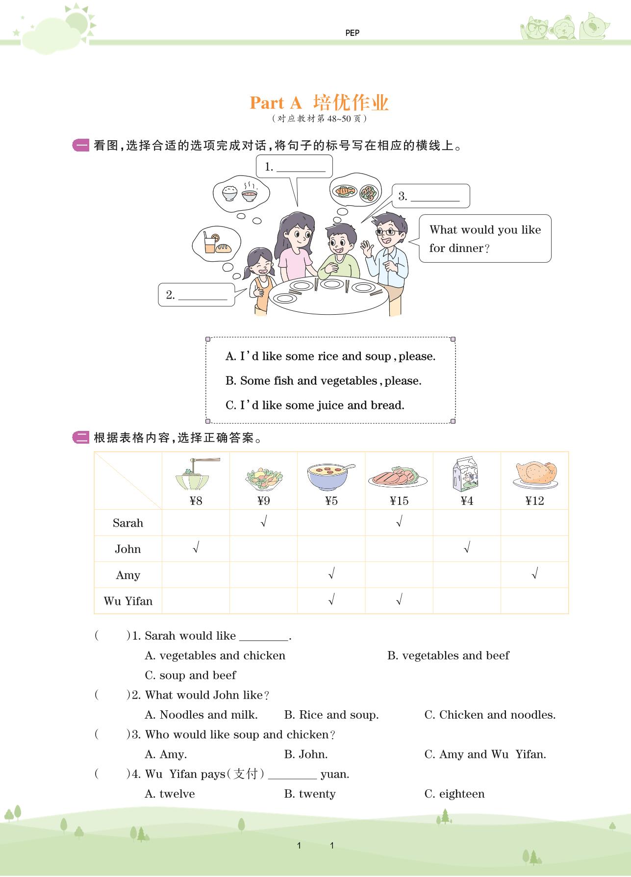 2020上册四年级英语PEP版 Unit 5—Part A 培优作业