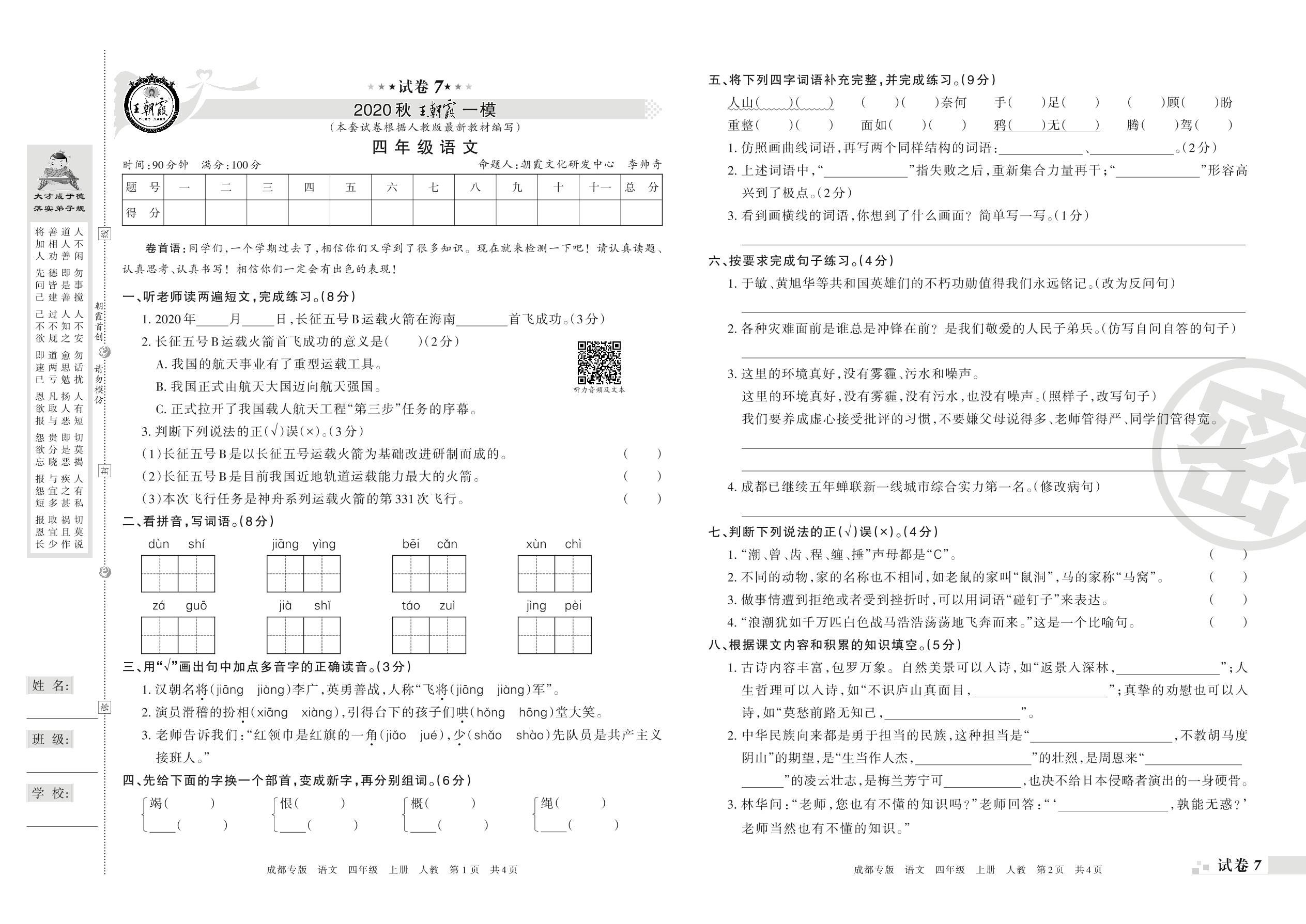 王朝霞期末模拟卷四年级上册语文(人教版)_R210801185842【7】