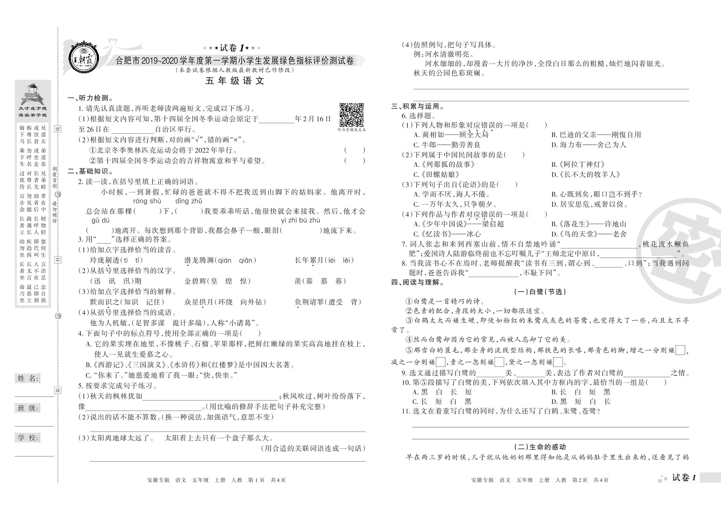 2019-2020学年第一学期合肥市五年级语文试卷(人教版)【1】