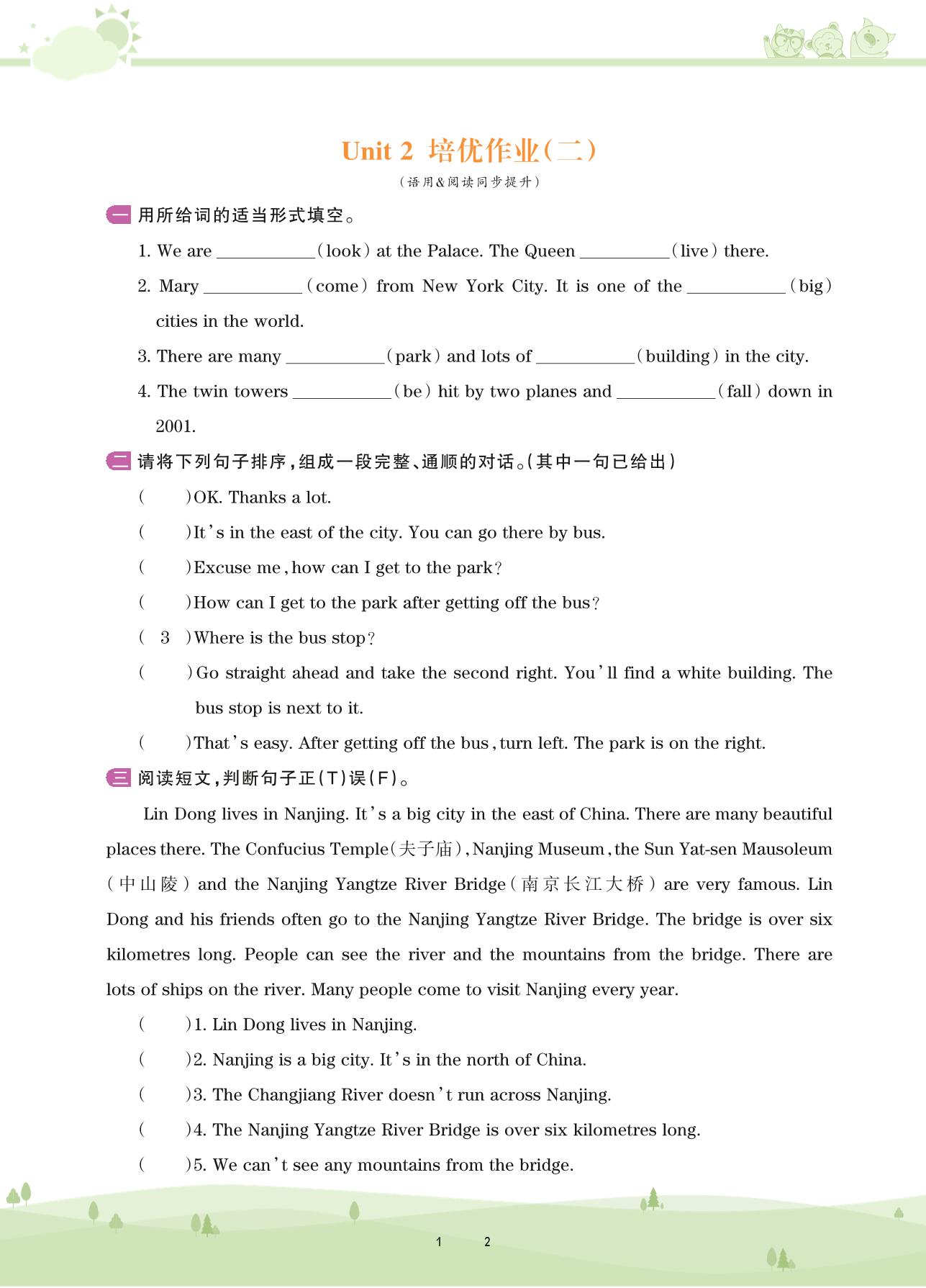 2020上册六年级英语剑桥版 Unit 2 培优作业(二)