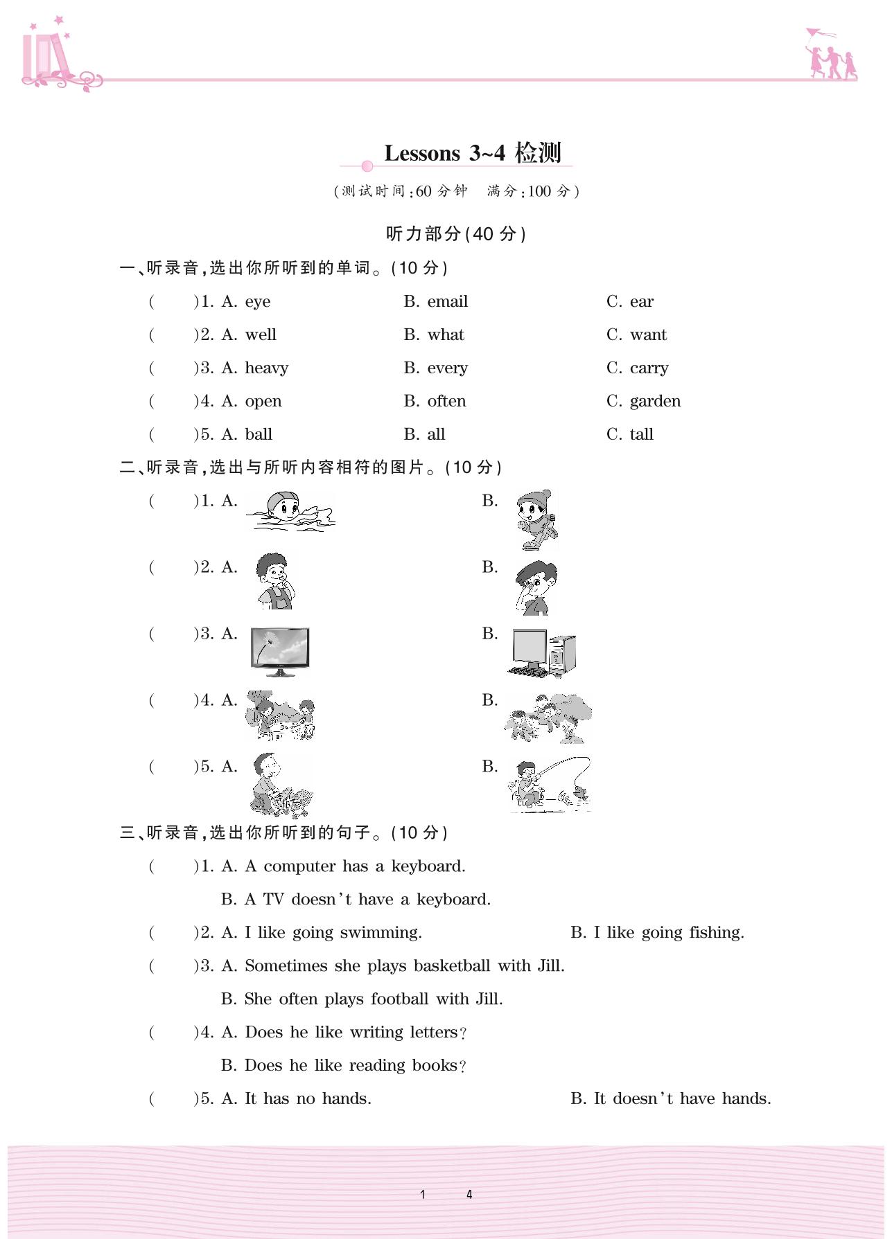 2020上册五年级英语科普版 Lessons 3~4检测