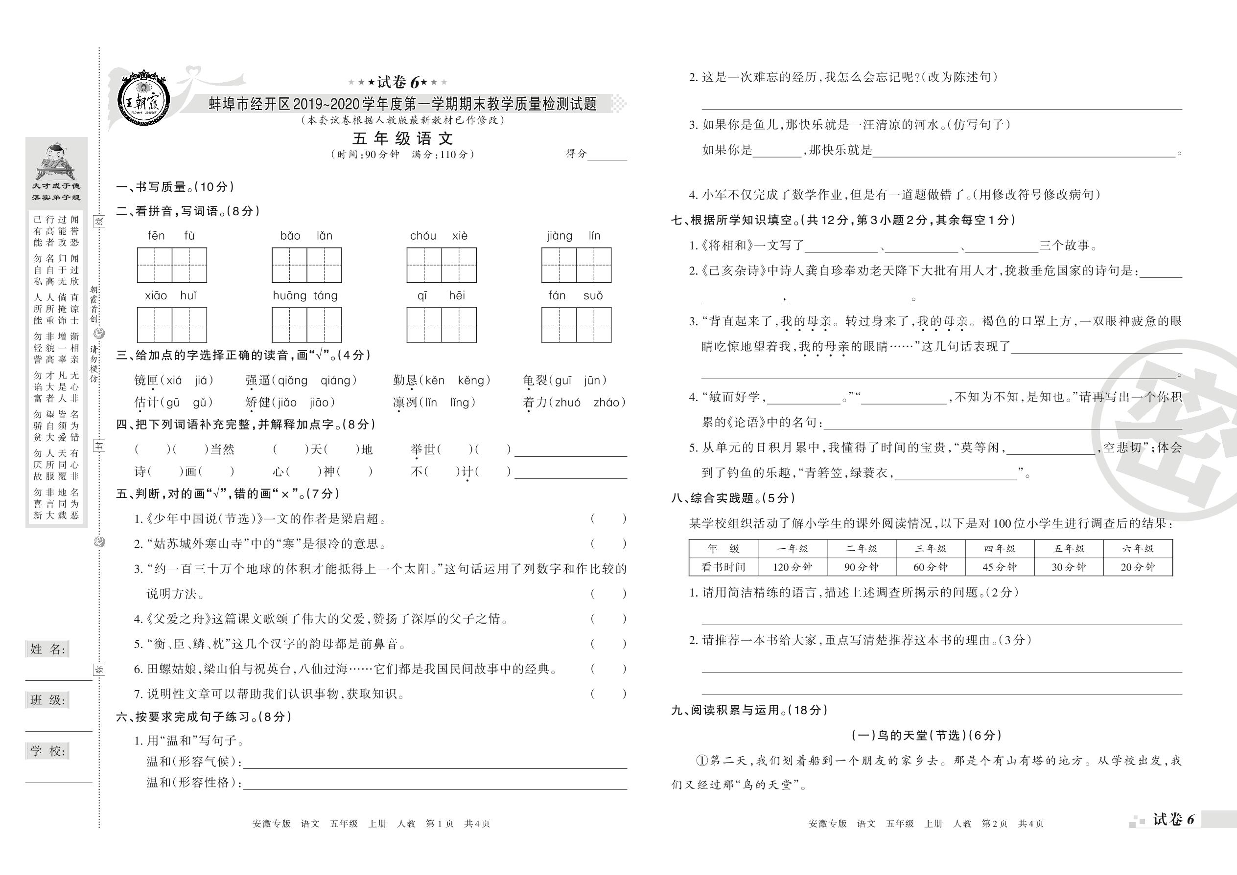 2019-2020学年第一学期蚌埠市经开区五年级语文试卷(人教版)【6】