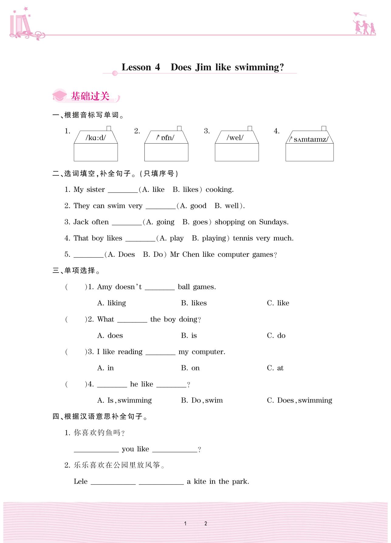 2020上册五年级英语科普版 Lesson 4 Does Jim like swimming?