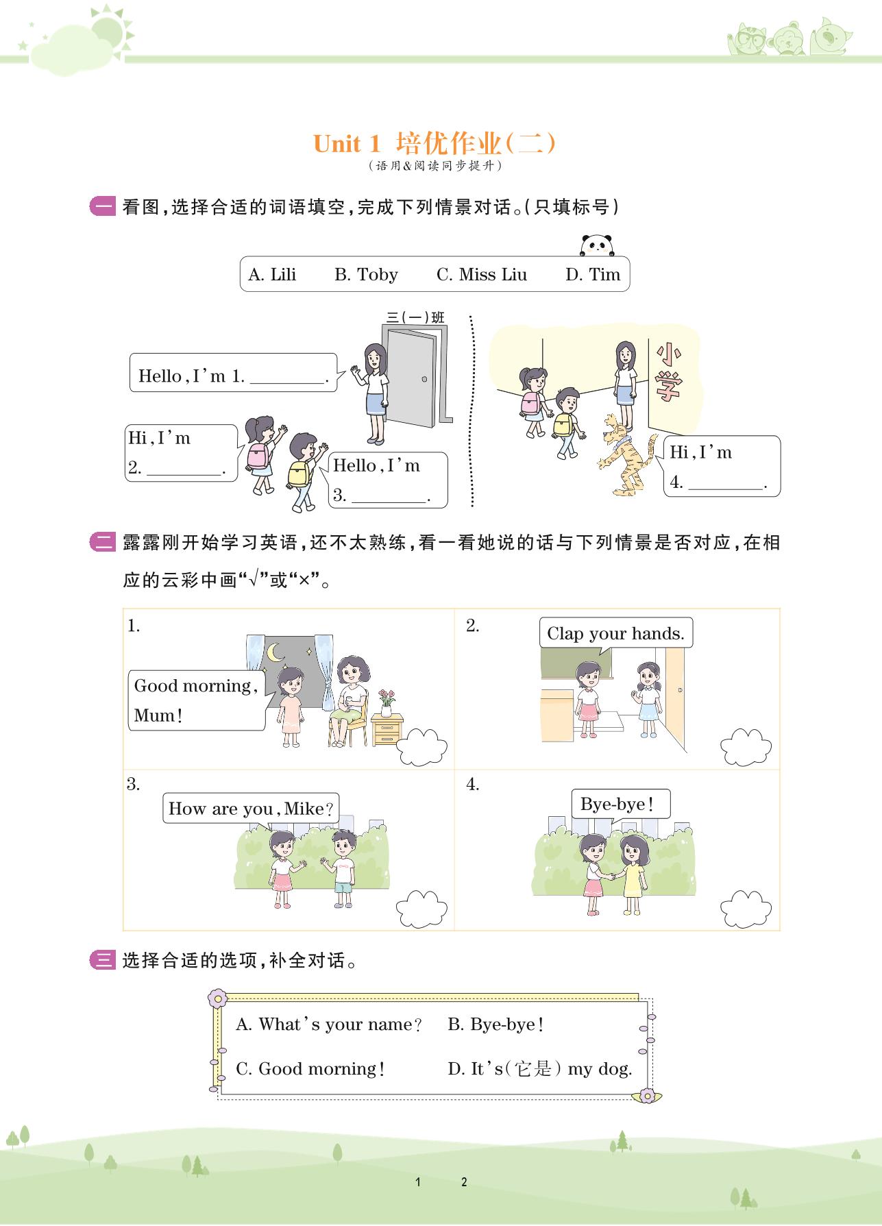 2020上册三年级英语剑桥版 Unit 1 培优作业(二)