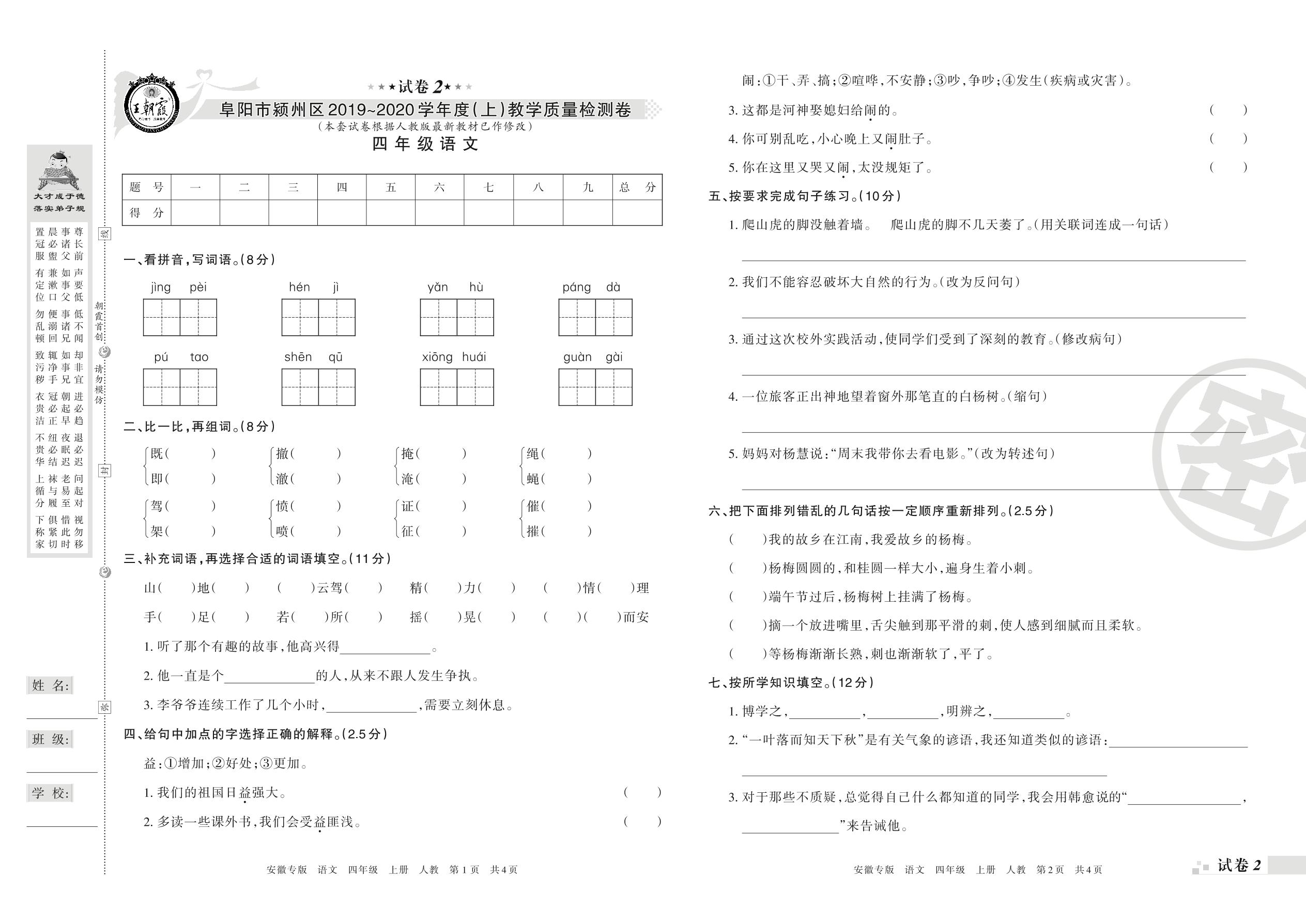 2019-2020学年第一学期阜阳市颍州市四年级语文试卷(人教版)【2】