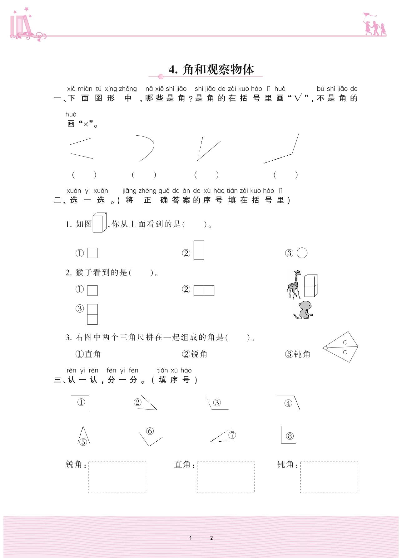 2020上册二年级数学人教版 9 总复习——4. 角和观察物体