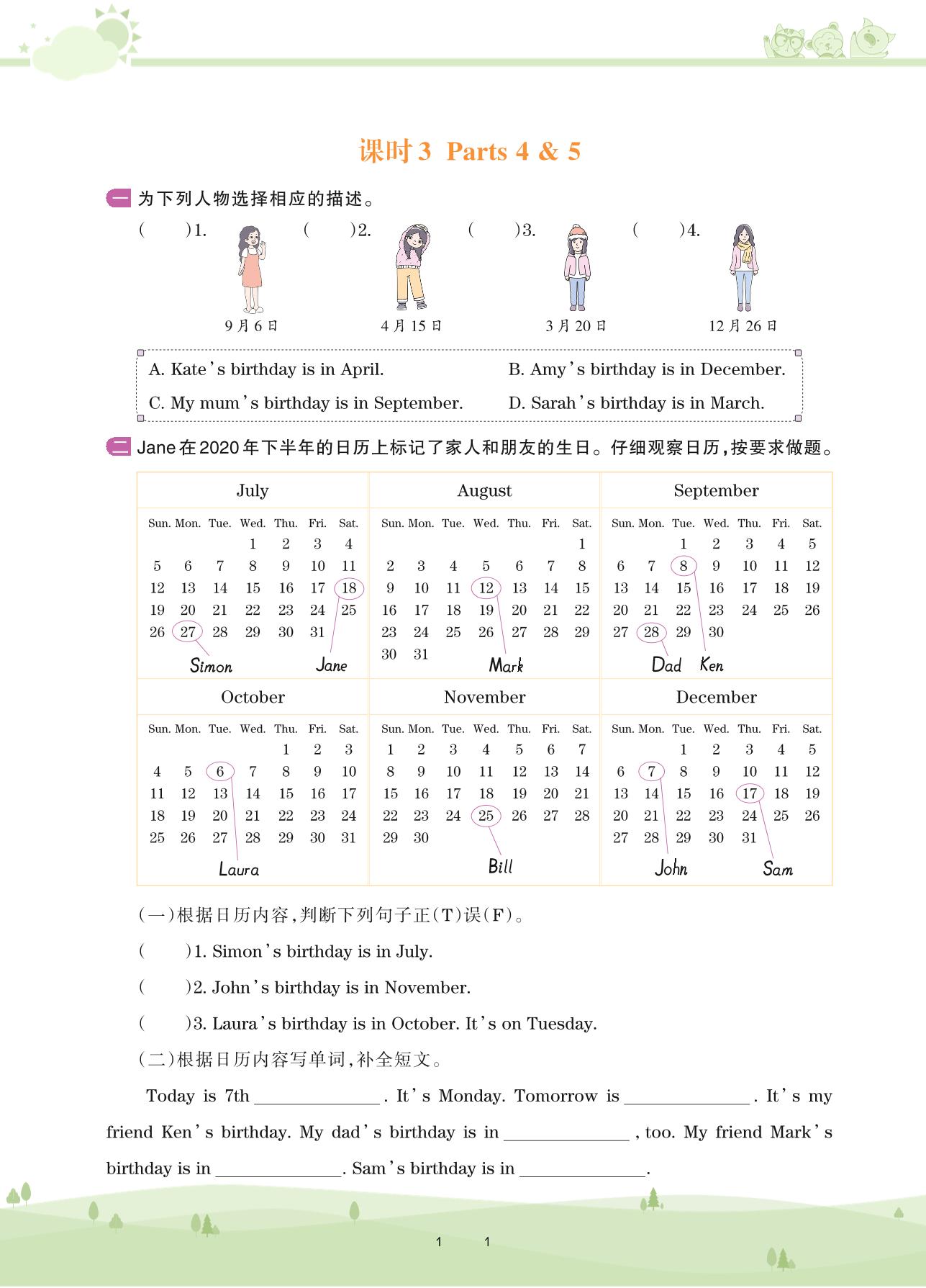 2020上册四年级英语剑桥版 Unit 1—课时3 Parts 4 & 5