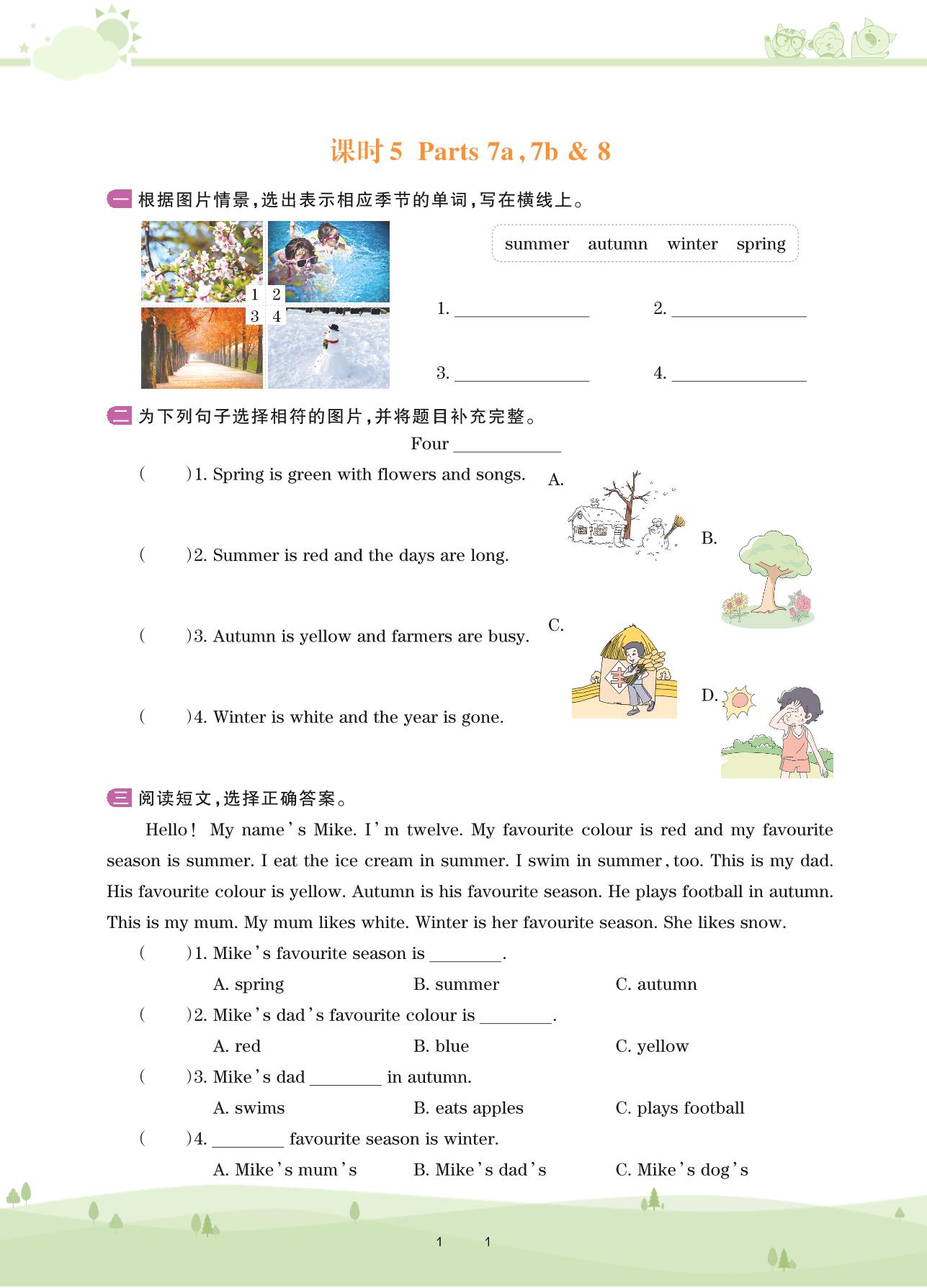 2020上册四年级英语剑桥版 Unit 1—课时5 Parts 7a,7b & 8