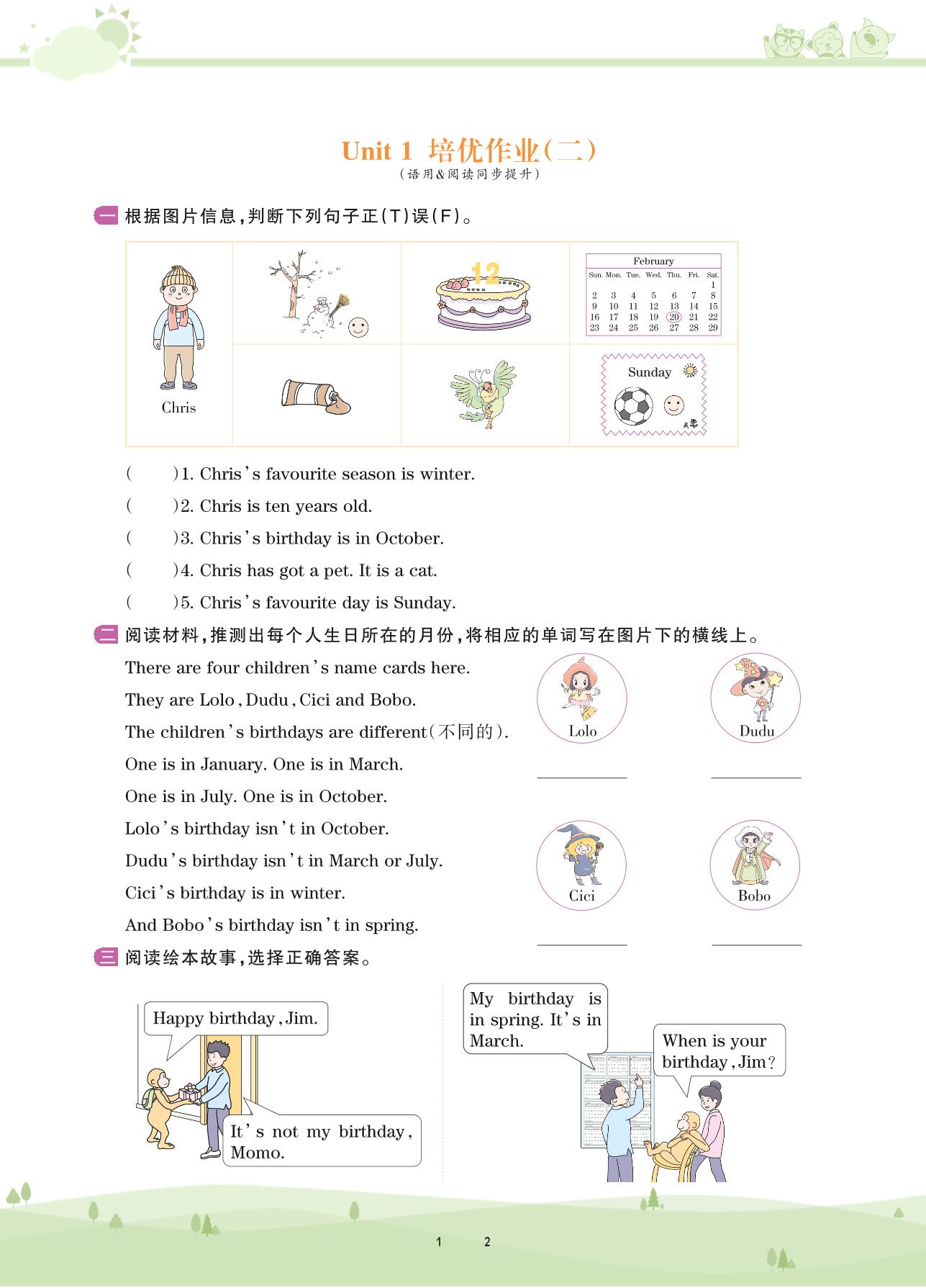 2020上册四年级英语剑桥版 Unit 1 培优作业(二)