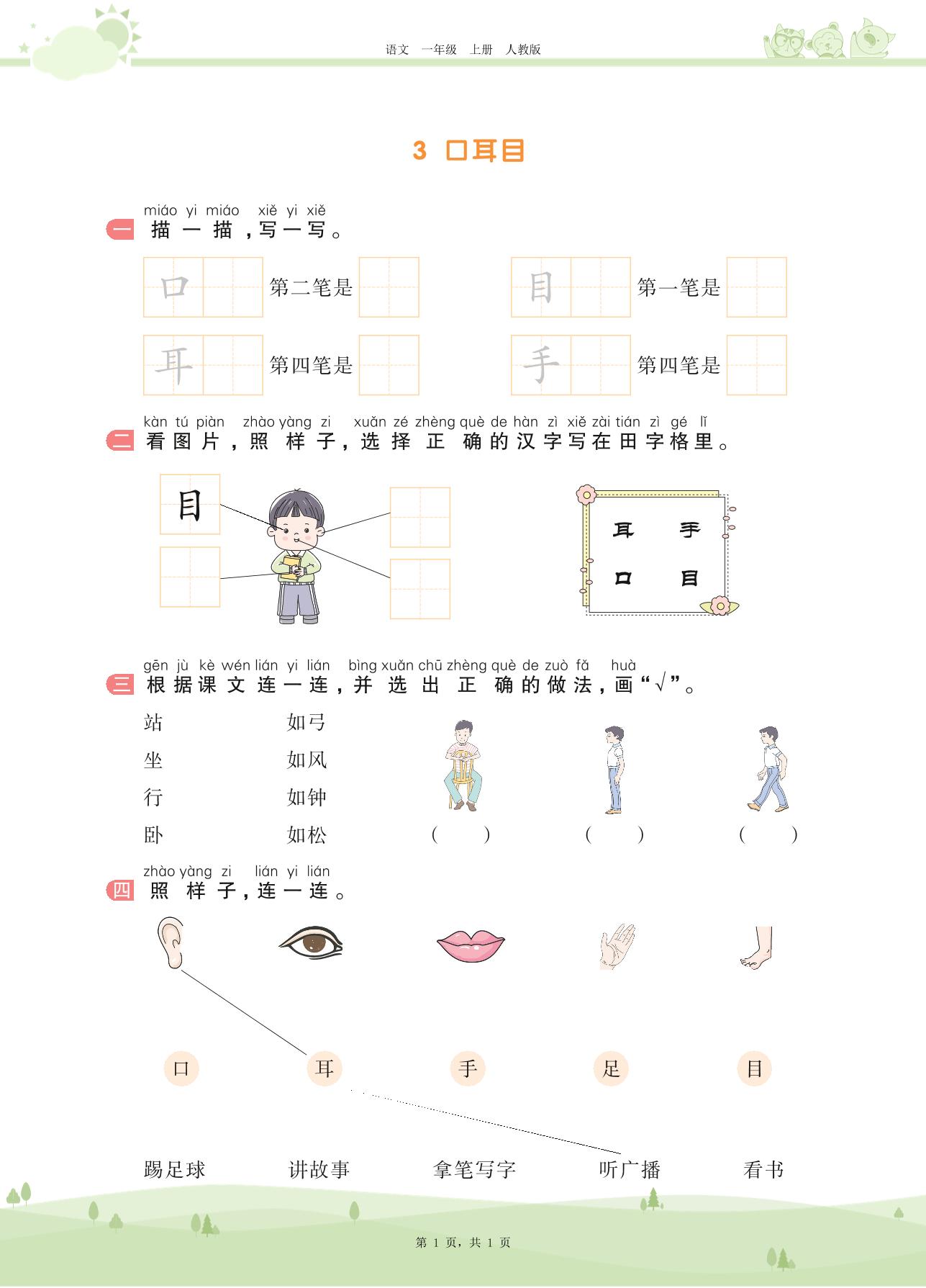 2020上册一年级语文人教版 第一单元 识字——3 口耳目