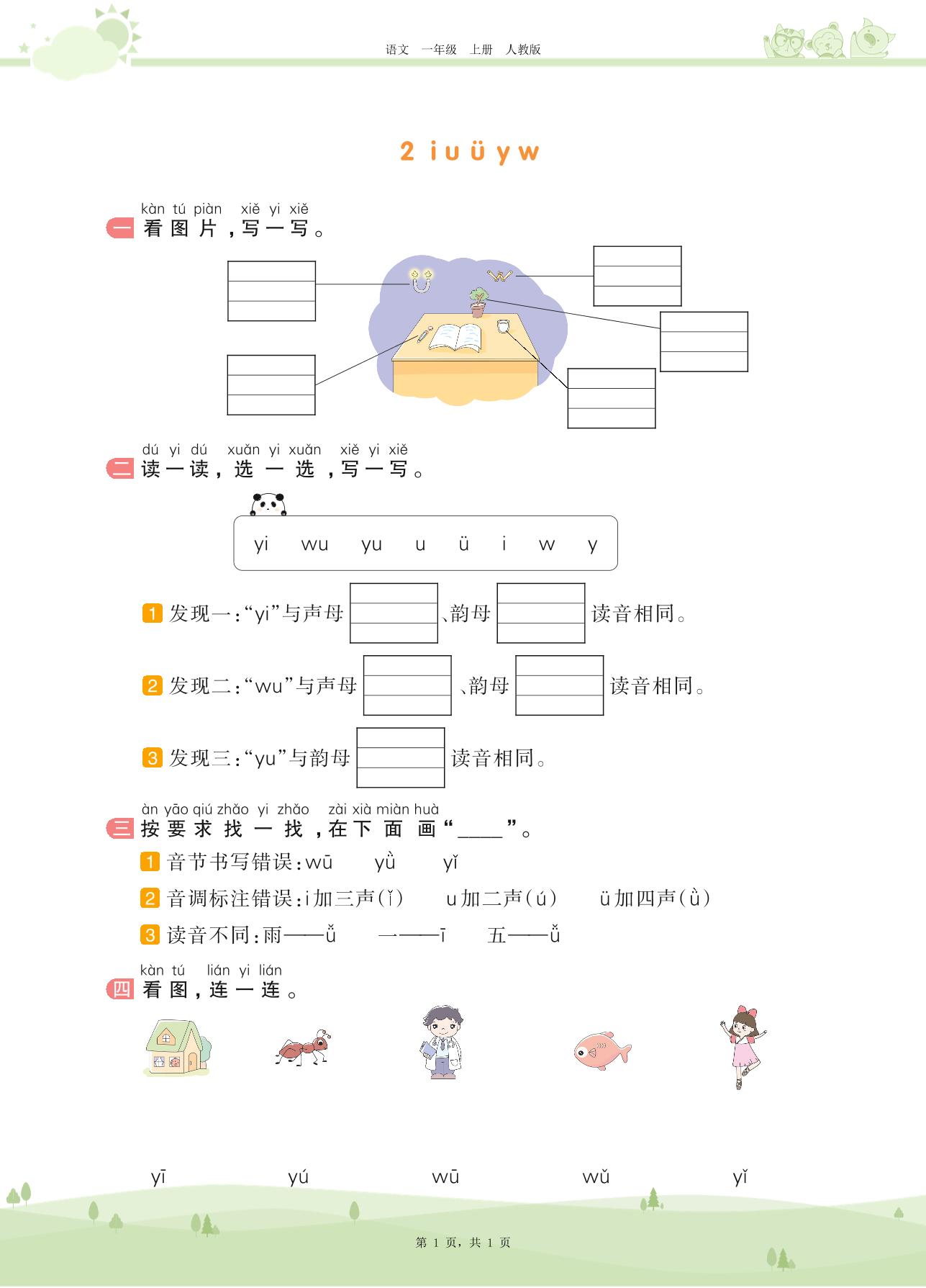 2020上册一年级语文人教版 第二单元 汉语拼音——2 i u ü y w