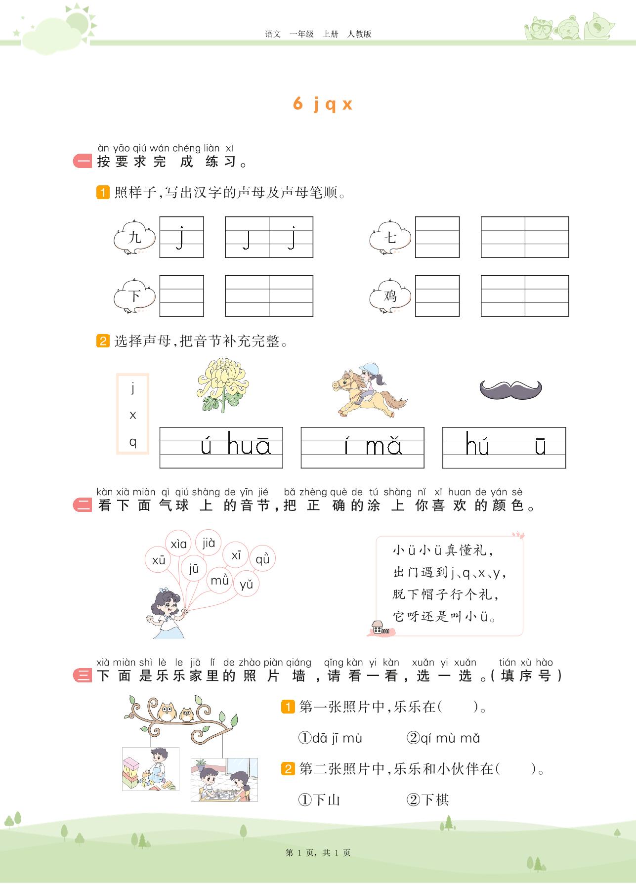 2020上册一年级语文人教版 第二单元 汉语拼音——6 j q x