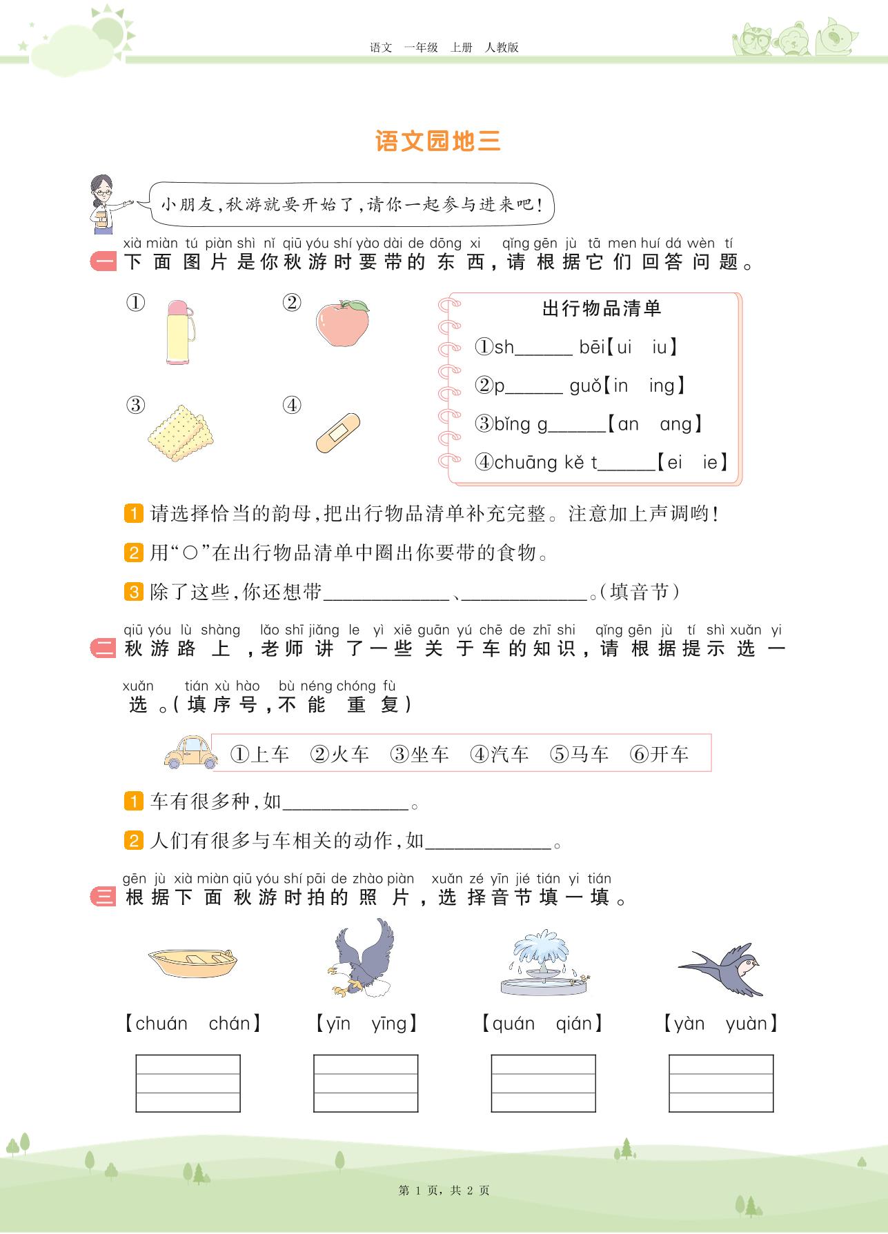 2020上册一年级语文人教版 第三单元 汉语拼音——语文园地三