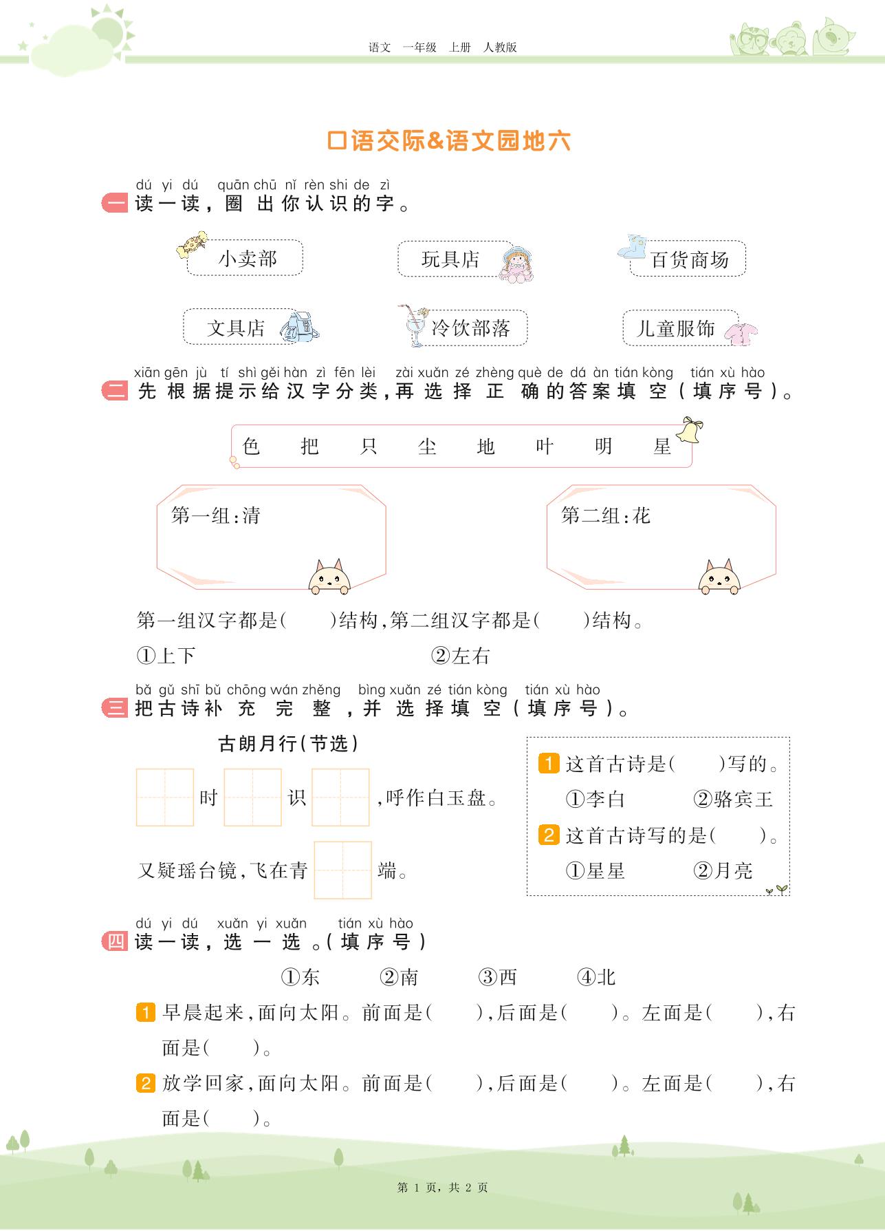 2020上册一年级语文人教版 第六单元 课文——口语交际&语文园地六