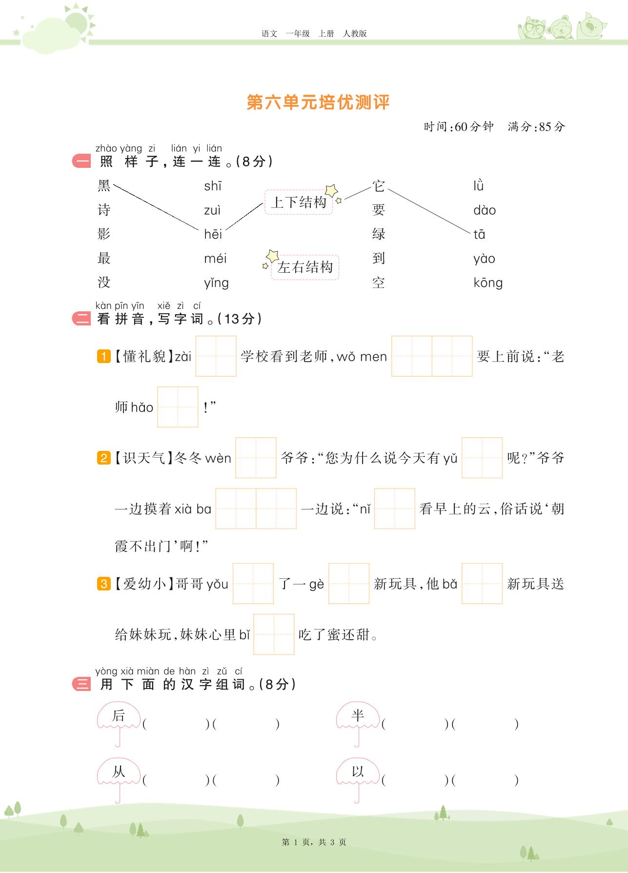 2020上册一年级语文人教版 第六单元培优测评