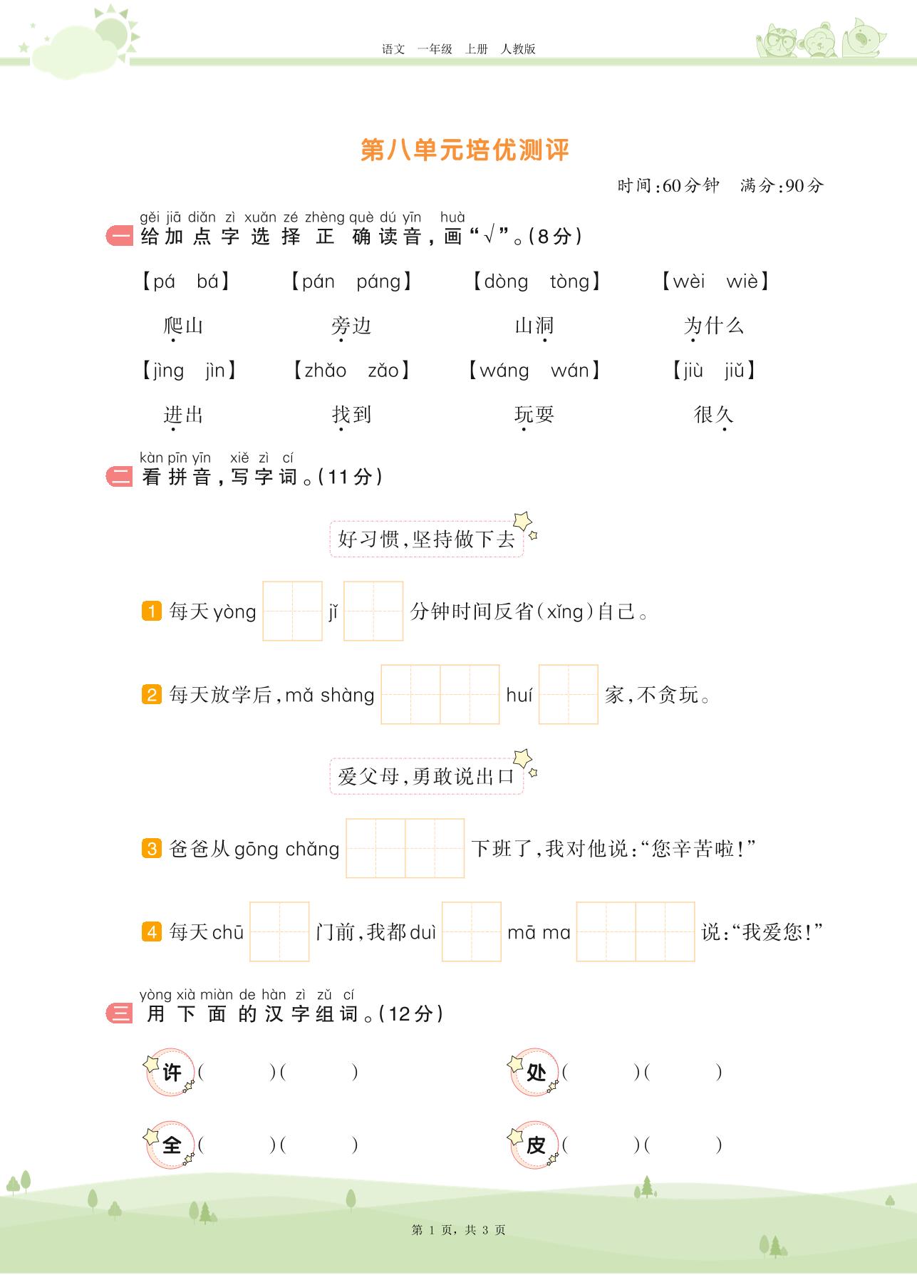 2020上册一年级语文人教版 第八单元培优测评
