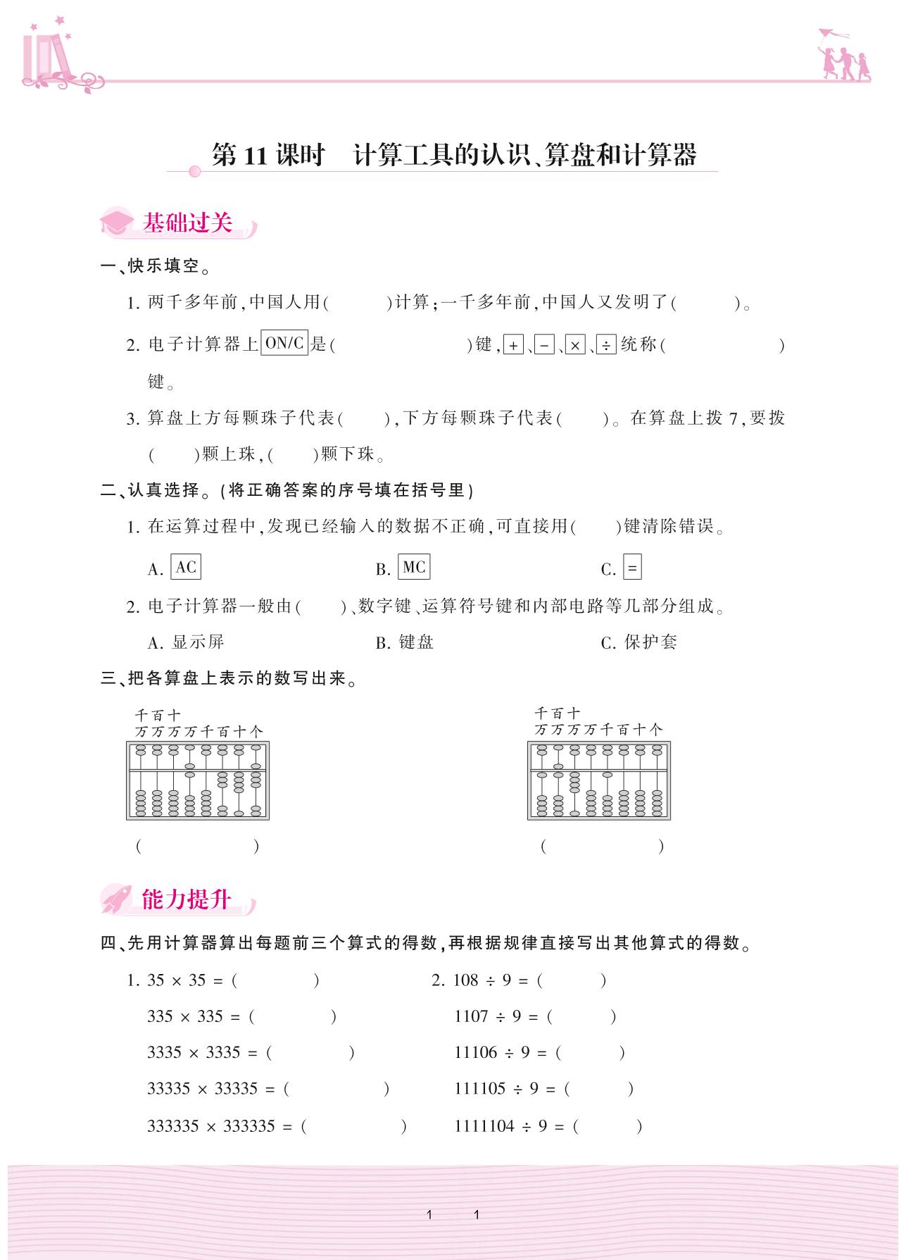 2020上册四年级数学人教版 1 大数的认识——第11课时 计算工具的认识、算盘和计算器