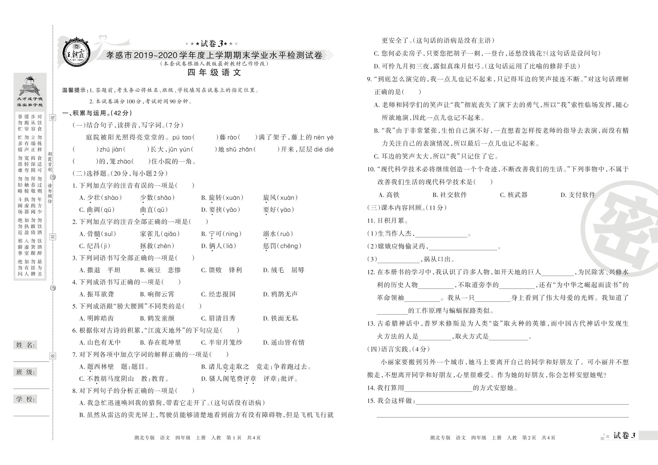 2019-2020学年第一学期孝感市四年级语文试卷(人教版)【3】