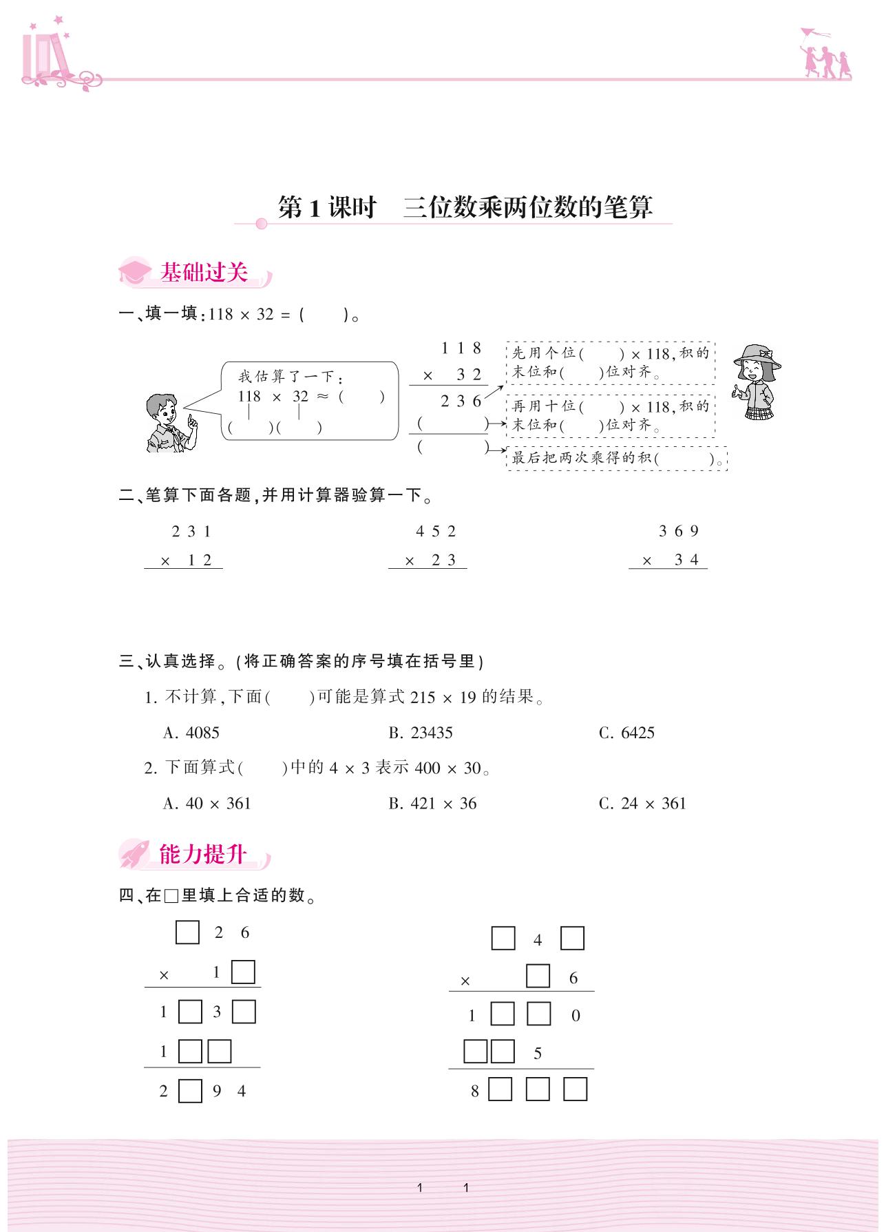 2020上册四年级数学人教版 4 三位数乘两位数——第1课时 三位数乘两位数的笔算