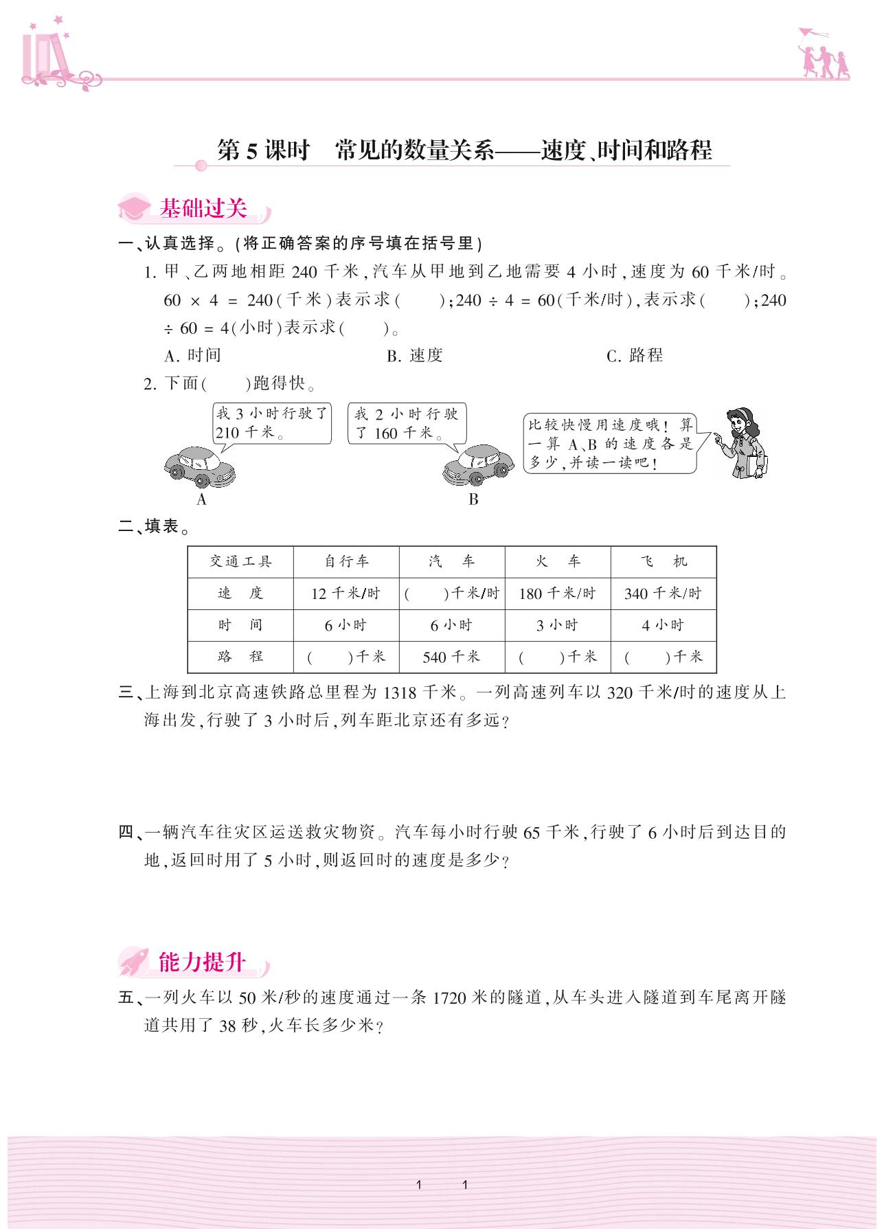 2020上册四年级数学人教版 4 三位数乘两位数——第5课时 常见的数量关系——速度、时间和路程