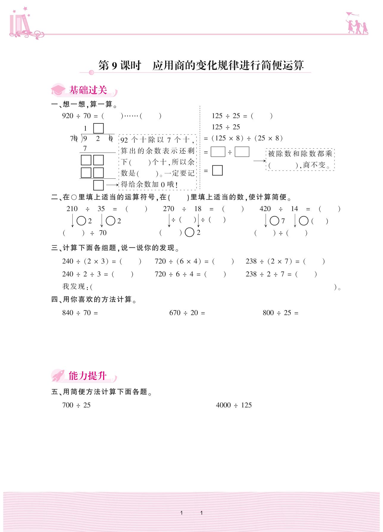 2020上册四年级数学人教版 6 除数是两位数的除法 2. 笔算除法——第9课时 应用商的变化规律进行简便运算