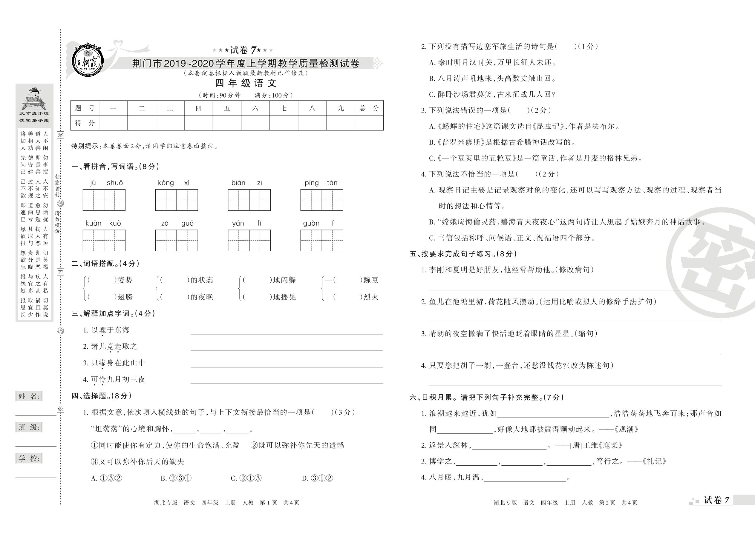 2019-2020学年第一学期荆门市四年级语文试卷(人教版)【7】