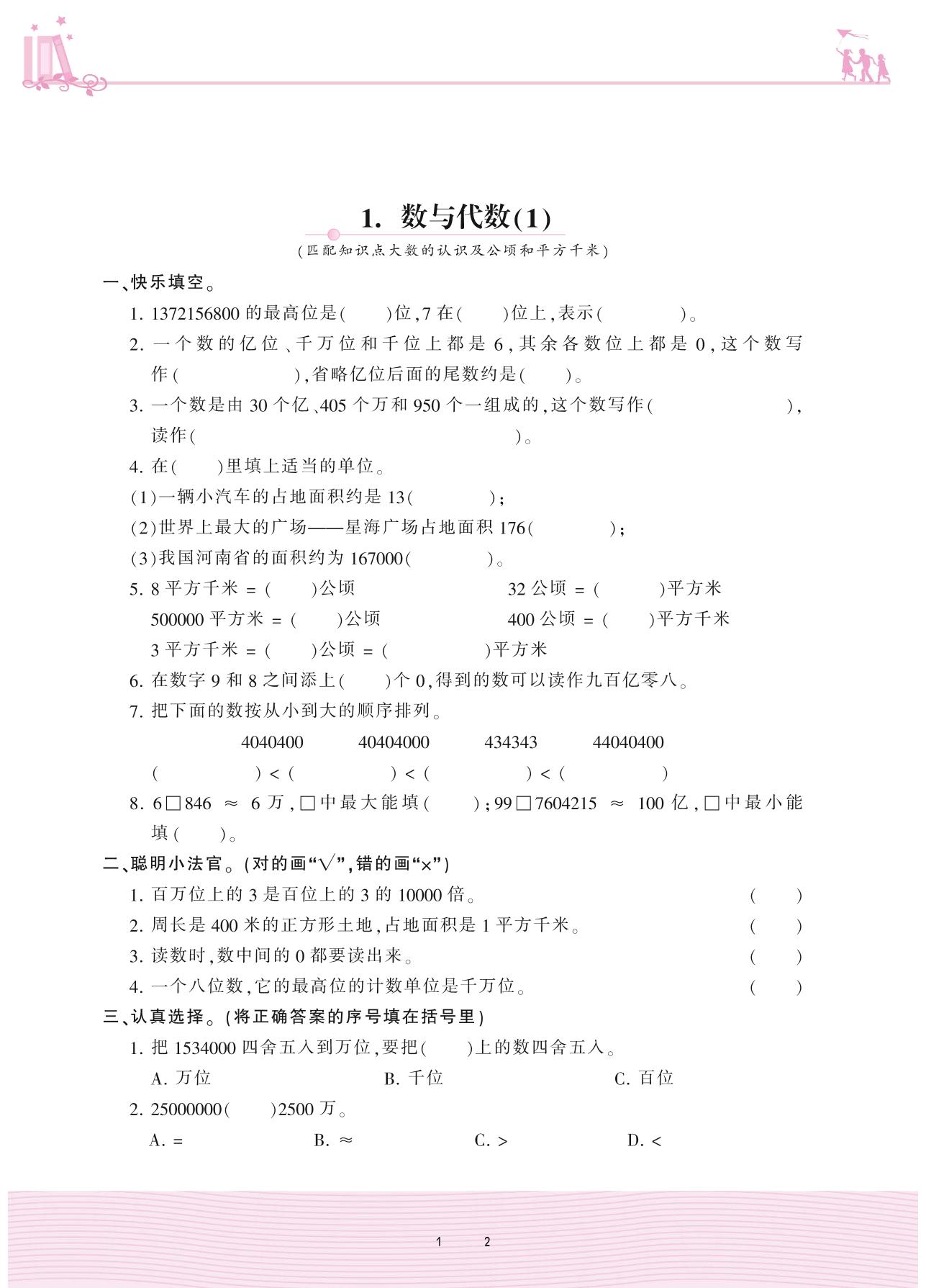 2020上册四年级数学人教版 9 总复习——1. 数与代数(1)