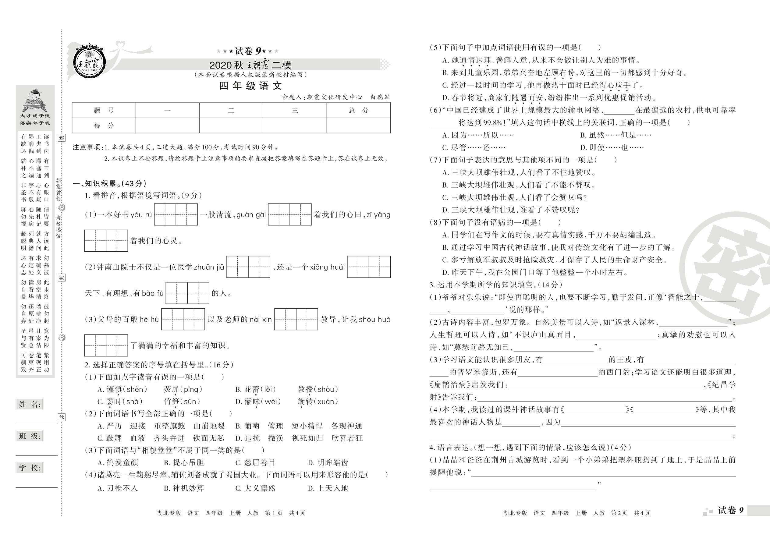 王朝霞期末模拟卷四年级上册语文(人教版)_R210801190625【9】