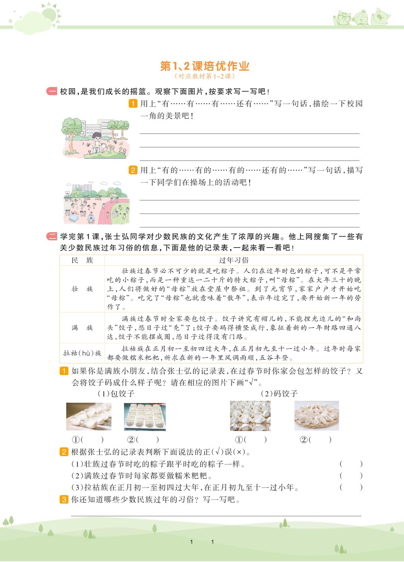 2020上册三年级语文人教版 第一单元——第1、2课培优作业