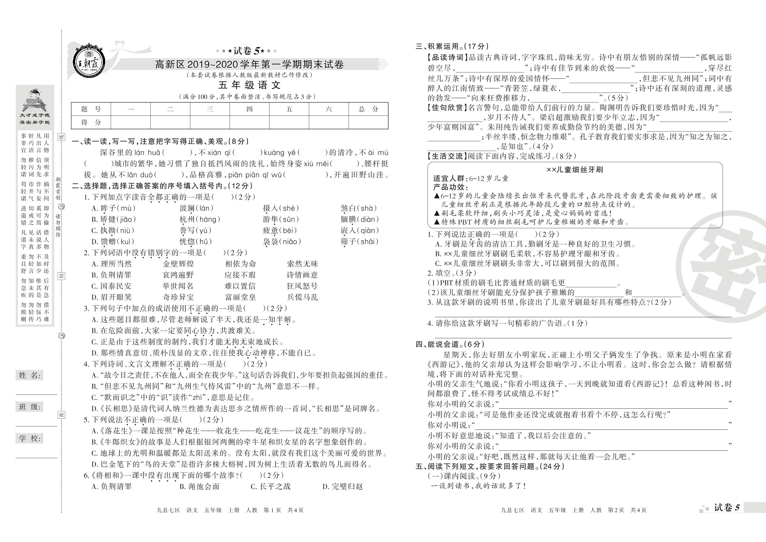2019-2020学年第一学期洛阳市高新区五年级语文试卷(人教版)【5】